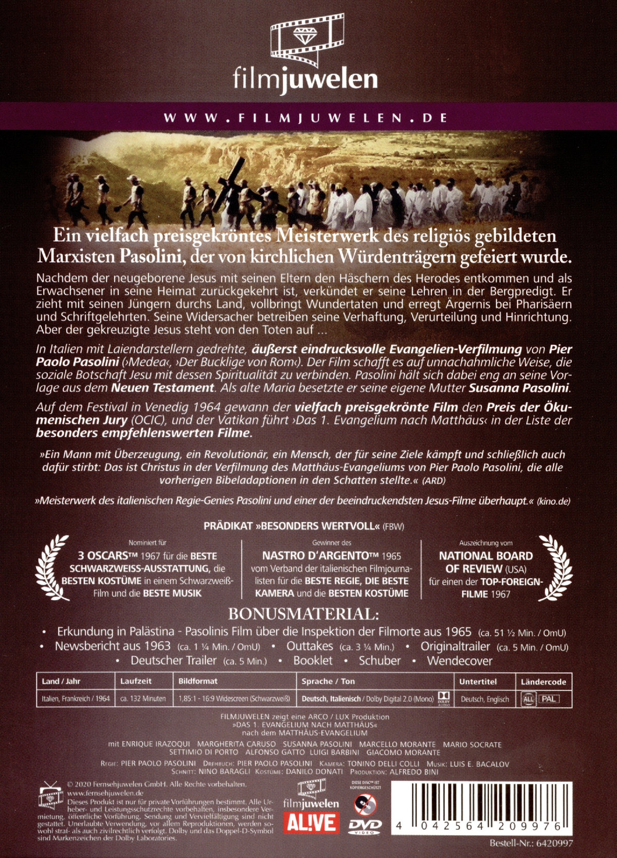 Ausstattung der DVD: Booklet, Schuber, Wendecover Bonusmaterial: "Erkundung in Palästina" - Pasolinis Film über die Inspektion der Filmorte aus dem Jahr 1965 (ca. 54 Min.), Newsbericht aus 1963 (ca. 1 Min.), Outtakes (ca. 1 Min.), Originaltrailer, weitere Highlights