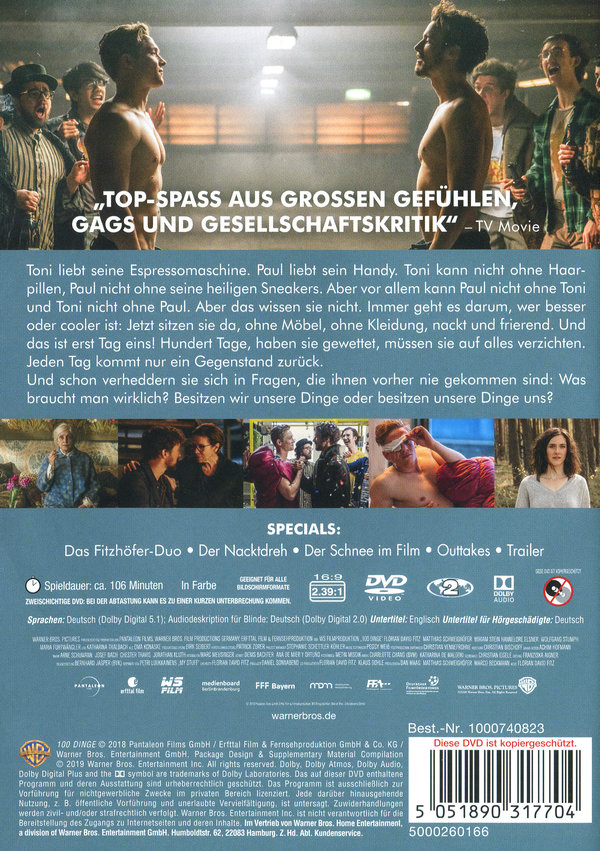 Toni liebt seine Espressomaschine. Paul liebt sein Handy. Toni kann nicht ohne Haarpillen, Paul nicht ohne seine heiligen Sneakers. Aber vor allem kann Paul nicht ohne Toni und Toni nicht ohne Paul. Aber das wissen sie nicht. Immer geht es darum, wer besser oder cooler ist, und das haben sie jetzt davon: Jetzt sitzen sie da, ohne Möbel, ohne Kleidung, nackt und verfroren. Hundert Tage, haben sie gewettet, müssen sie auf alles verzichten. Jeden Tag kommt nur ein Gegenstand zurück. Und das ist erst Tag eins!