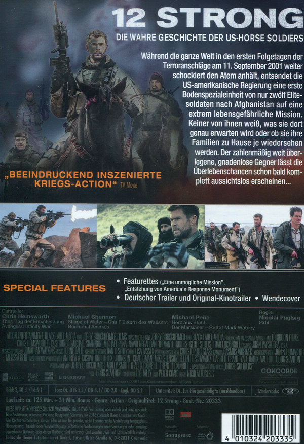 Während die ganze Welt in den ersten Folgetagen der Terroranschläge am 11. September 2001 weiter schockiert den Atem anhält, entsendet die US amerikanische Regierung eine erste Bodenspezialeinheit von nur zwölf Elitesoldaten nach Afghanistan auf eine extrem lebensgefährliche Mission. Keiner von ihnen weiß, was sie dort genau erwarten wird oder ob sie ihre Familien zu Hause je wiedersehen werden. Mitch Nelson (CHRIS HEMSWORTH), der noch recht neue befehlshabende Captain führt seine Männer direkt in das unwegsame Gebiet des Hindukusch-Gebirges, um mit diplomatischem Geschick und großem Mut die dort kontrollierende afghanischen Nordallianz zu einem bislang ungeahnten Bündnis im Kampf gegen die gemeinsamen Gegner aus Taliban- und Al-Kaida-Kämpfern zu überzeugen. Gegenseitiges Misstrauen und scheinbar enorme kulturelle Unterschiede erschweren die Zusammenarbeit nicht weniger als der Mangel an moderner Ausrüstung. Die ungewohnten und archaischen Kampfstrategien der afghanischen Reitersoldaten stellen die hochtechnisiert ausgebildeten US-Elitesoldaten vor weitere gefährliche Herausforderungen. Der zahlenmäßig weit überlegene, gnadenlose Gegner lässt die Überlebenschancen der ungleichen Verbündeten schon bald komplett aussichtlos erscheinen...