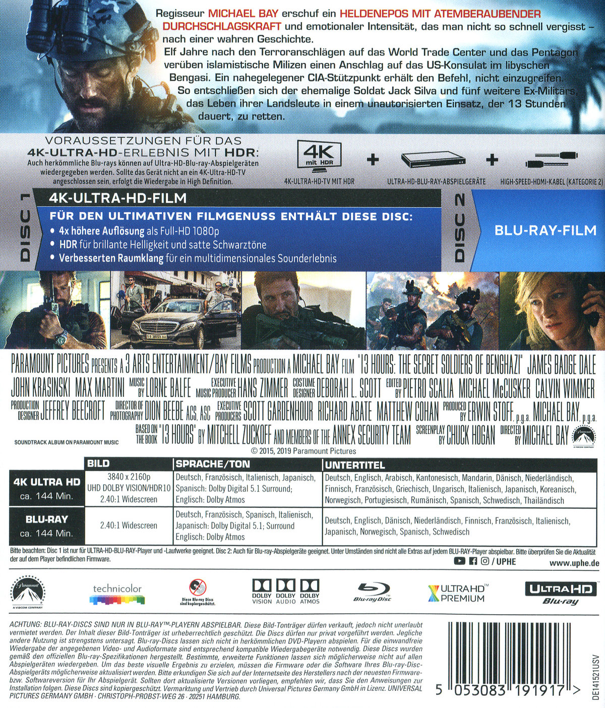 "Packender Actionthriller in realistischem Look" - HörzuIn einer ausweglos scheinenden Situation fassen sechs Männer den Mut, das Richtige zu tun und sich dafür auch über einen Befehl von oberster Stelle hinwegzusetzen.Mit "13 Hours: The Secret Soldiers of Benghazi" präsentiert der visionäre Regisseur Michael Bay ein schonungsloses, auf einer wahren Geschichte basierendes Action-Drama, das beweist, dass die Realität zynischer und dramatischer ist als jede Fiktion.Darin versucht eine kleine, aus Ex-Militärs bestehende Eliteeinheit, bei dem Anschlag auf das US-Konsulat im libyschen Bengasi das Leben ihrer Landsleute gegen alle Widerstände zu retten.Heraus kam ein Heldenepos von atemberaubender Durchschlagskraft und emotionaler Intensität, das man nicht so schnell vergisst."Aufregendes Adrenalin-Kino!" - TV Movie