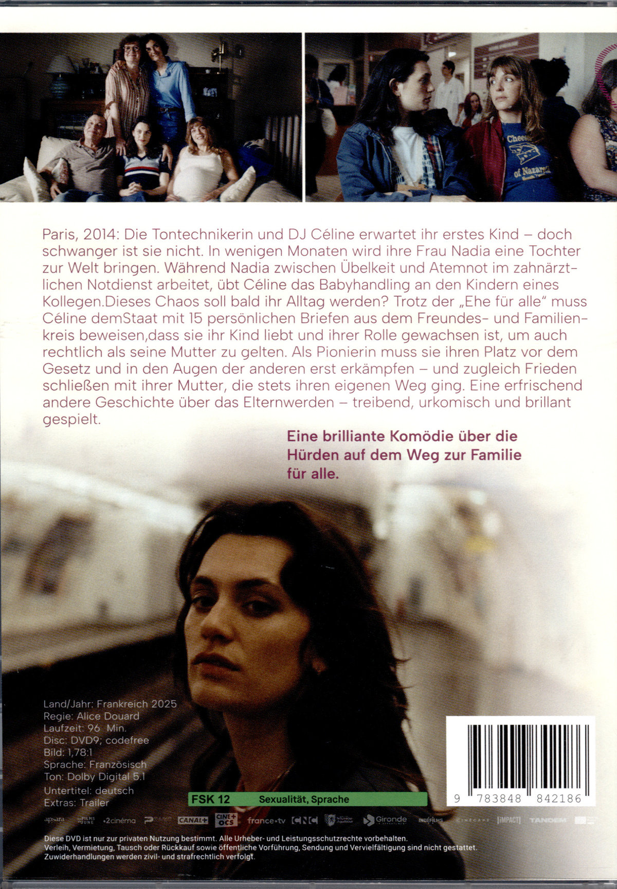 Paris, 2014: Die Tontechnikerin und DJ Céline erwartet ihr erstes Kind – doch schwanger ist sie nicht. In wenigen Monaten wird ihre Frau Nadia eine Tochter zur Welt bringen. Während Nadia zwischen Übelkeit und Atemnot im zahnärztlichen Notdienst arbeitet, übt Céline das Babyhandling an den Kindern eines Kollegen. Dieses Chaos soll bald ihr Alltag werden? Trotz der „Ehe für alle" muss Céline dem Staat mit 15 persönlichen Briefen aus dem Freundes- und Familienkreis beweisen, dass sie ihr Kind liebt und ihrer Rolle gewachsen ist, um auch rechtlich als seine Mutter zu gelten. Als Pionierin muss sie ihren Platz vor dem Gesetz und in den Augen der anderen erst erkämpfen – und zugleich Frieden schließen mit ihrer Mutter, die stets ihren eigenen Weg ging. Eine erfrischend andere Geschichte über das Elternwerden – treibend, urkomisch und brillant gespielt.