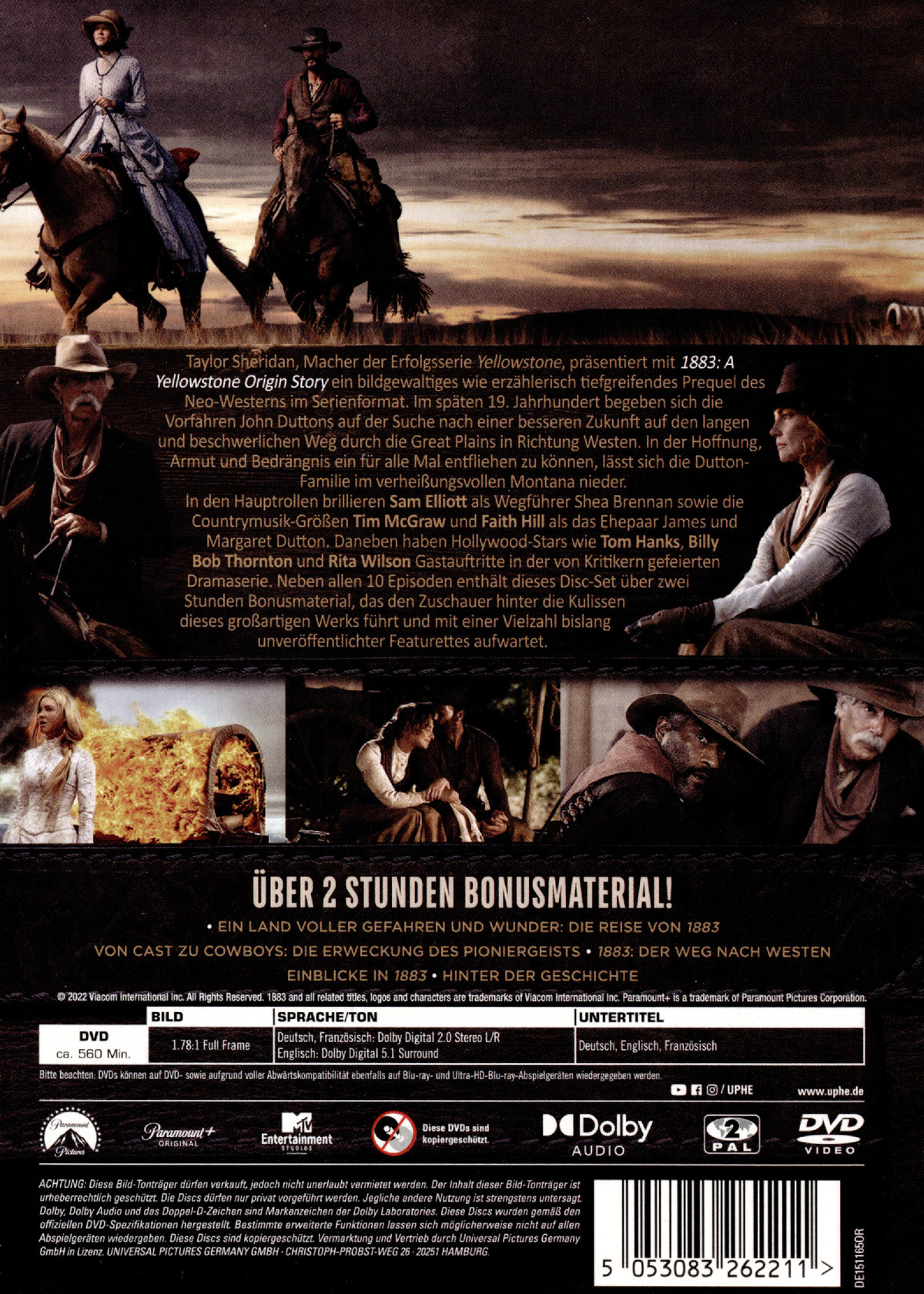 Taylor Sheridan, Macher der Erfolgsserie "Yellowstone", präsentiert mit "1883" ein bildgewaltiges wie erzählerisch tiefgreifendes Prequel des Neo-Westerns im Serienformat. Im späten 19. Jahrhundert begeben sich die Vorfahren John Duttons auf einen langen und beschwerlichen Weg durch die Great Plains in Richtung Westen auf der Suche nach einer besseren Zukunft. In der Hoffnung Armut und Bedrängnis ein für alle Mal entfliehen zu können, lässt sich die Dutton-Familie im verheißungsvollen Montana nieder.In den Hauptrollen brillieren Sam Elliot als Wegführer Shea Brennan sowie die Countrymusik-Größen Tim McGraw und Faith Hill als Ehepaar James und Margaret Dutton. Daneben feiern Hollywood-Stars wie Tom Hanks, Billy Bob Thornton und Rita Wilson Gastauftritte in der von Kritikern gefeierten Dramaserie. Neben allen 10 Episoden enthält dieses Disc-Set über zwei Stunden Bonusmaterial, das den Zuschauer hinter die Kulissen dieses großartigen Machwerks führt und mit einer Vielzahl bislang unveröffentlichter Featurettes aufwartet.10 Episoden auf 4 Discs. Episodenübersicht- 1883- Den Abgrund im Rücken- Der Fluss- Die Überquerung- Die Freiheit hat Zähne- Dem Teufel wird langweilig- Blitzgelbes Haar- Die Tränen der Kapitulation- Rasende Wolken- Dies ist nicht euer Himmel