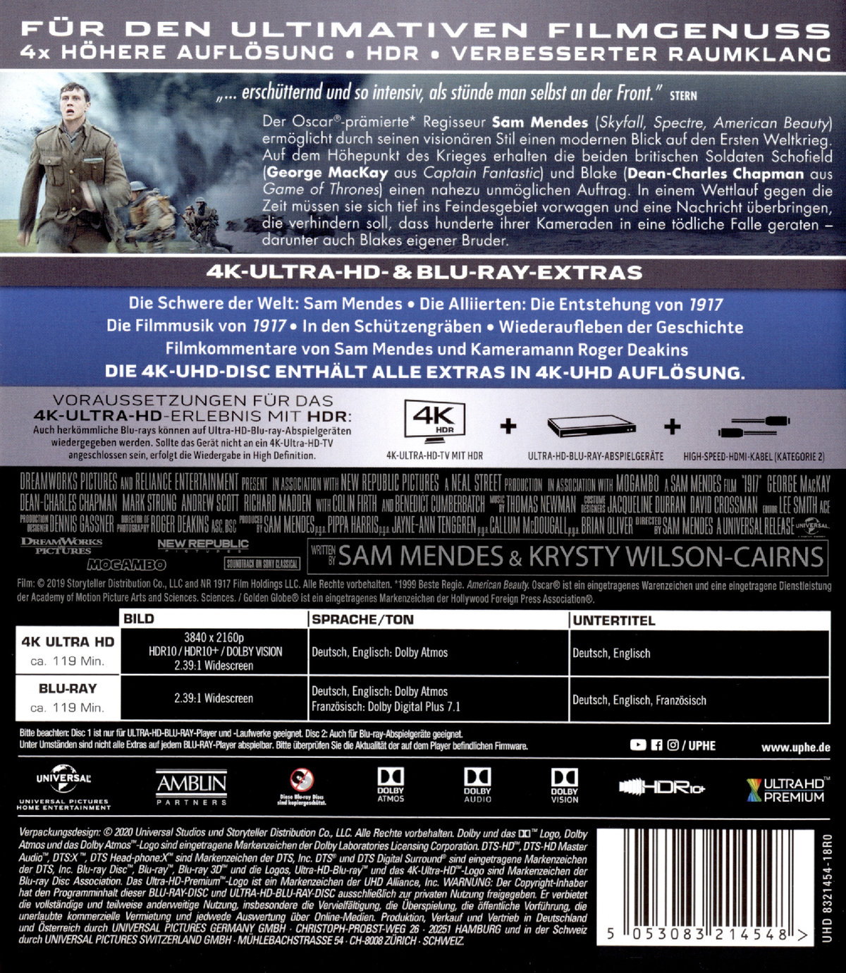 "Ein Kinoerlebnis, erschütternd und so intensiv, als stünde man selbst an der Front" (Stern)Der Oscar®-preisgekrönte Regisseur Sam Mendes ("Skyfall", "Spectre", "American Beauty") ermöglicht durch seinen visionären Stil einen modernen Blick auf den ersten Weltkrieg.Auf dem Höhepunkt des Ersten Weltkrieges erhalten die beiden britischen Soldaten Schofield (George MacKay aus "Captain Fantastic") und Blake (Dean-Charles Chapman aus "Game of Thrones") einen nahezu unmöglichen Auftrag. In einem Wettlauf gegen die Zeit müssen sie sich tief ins Feindesgebiet wagen und eine Nachricht überbringen, die verhindern soll, dass hunderte ihrer Kameraden in eine tödliche Falle geraten - darunter auch Blakes eigener Bruder."Fulminant erzähltes Kriegsfilmspektakel für Cineasten" (TV Spielfilm)"Hart, spannend, aufwühlend" (Focus)