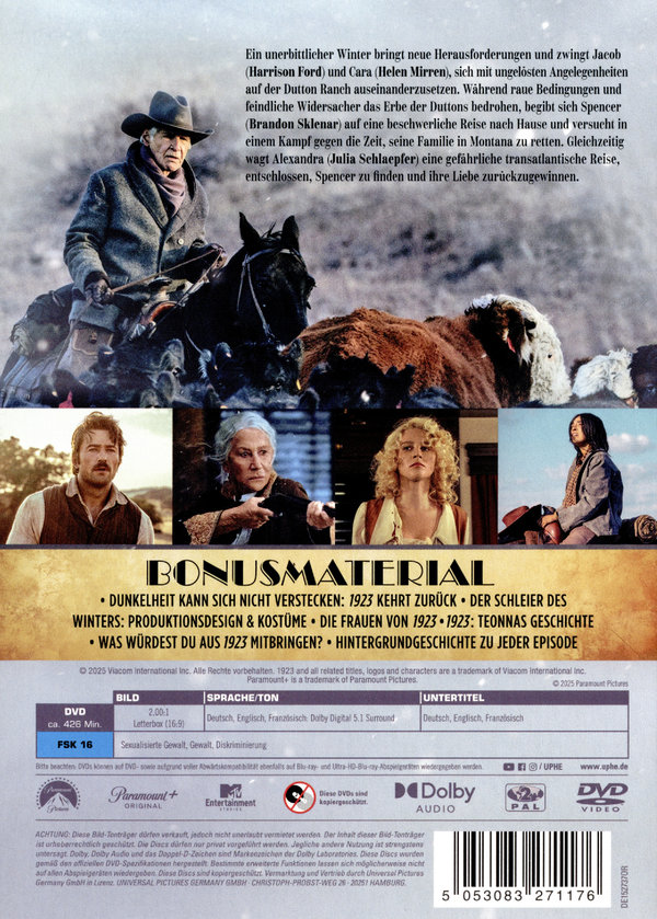 Ein unerbittlicher Winter bringt neue Herausforderungen und zwingt Jacob (Harrison Ford) und Cara (Helen Mirren), sich mit ungelösten Angelegenheiten auf der Dutton Ranch auseinanderzusetzen. Während raue Bedingungen und feindliche Widersacher das Erbe der Duttons bedrohen, begibt sich Spencer (Brandon Sklenar) auf eine beschwerliche Reise nach Hause und versucht in einem Kampf gegen die Zeit, seine Familie in Montana zu retten. Gleichzeitig wagt Alexandra (Julia Schlaepfer) eine gefährliche transatlantische Reise, entschlossen, Spencer zu finden und ihre Liebe zurückzugewinnen.Alle 7 Episoden der zweiten Staffel auf 3 DiscsEpisodenübersicht- Die tödliche Jahreszeit- Winter der Gewalt- Umgeben vom Schrecken- Die eisernen Flüsse- Nur Schüsse leiten uns- Berge, Eis und Monster- Ein Traum und eine Erinnerung