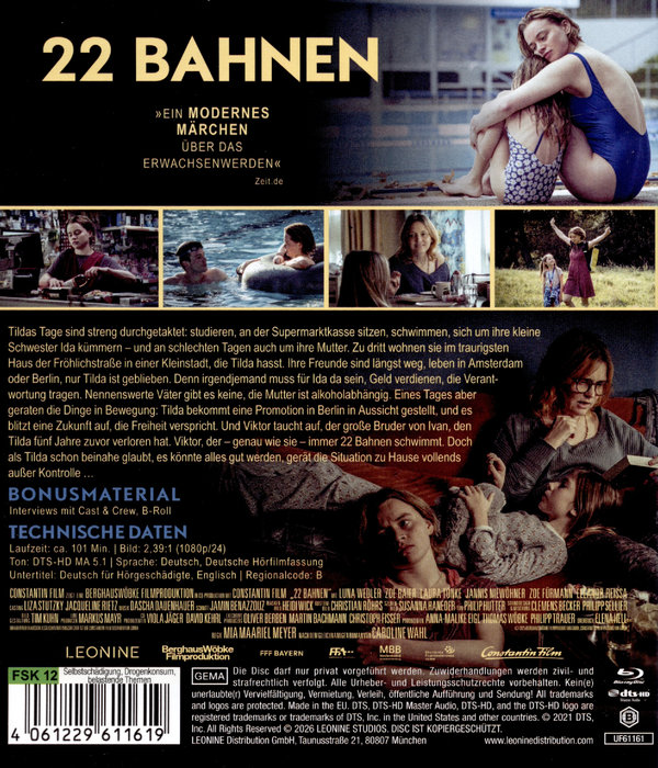 Tildas Tage sind streng durchgetaktet: studieren, an der Supermarktkasse sitzen, schwimmen, sich um ihre kleine Schwester Ida kümmern - und an schlechten Tagen auch um ihre Mutter. Zu dritt wohnen sie im traurigsten Haus der Fröhlichstraße in einer Kleinstadt, die Tilda hasst. Ihre Freunde sind längst weg, leben in Amsterdam oder Berlin, nur Tilda ist geblieben. Denn irgendjemand muss für Ida da sein, Geld verdienen, die Verantwortung tragen. Nennenswerte Väter gibt es keine, die Mutter ist alkoholabhängig. Eines Tages aber geraten die Dinge in Bewegung: Tilda bekommt eine Promotion in Berlin in Aussicht gestellt, und es blitzt eine Zukunft auf, die Freiheit verspricht. Und Viktor taucht auf, der große Bruder von Ivan, den Tilda fünf Jahre zuvor verloren hat. Viktor, der - genau wie sie - immer 22 Bahnen schwimmt. Doch als Tilda schon beinahe glaubt, es könnte alles gut werden, gerät die Situation zu Hause vollends außer Kontrolle…