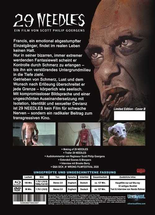 Francis, ein emotional abgestumpfter Einzelgänger, findet im realen Leben keinen Halt. Nur in seiner bizarren, immer extremer werdenden Fantasiewelt scheint er Kontrolle durch Schmerz zu erlangen - bis ihn ein verstörendes Untergrundmilieu in die Tiefe zieht. Getrieben von Schmerz, Lust und dem Wunsch nach Erlösung überschreitet er jede Grenze - körperlich wie seelisch. Mit kompromissloser Bildsprache und einer ungeschönten Auseinandersetzung mit Isolation, Identität und sexueller Devianz ist 29 NEEDLES kein Film für schwache Nerven - sondern ein radikaler Beitrag zum transgressiven Kino.