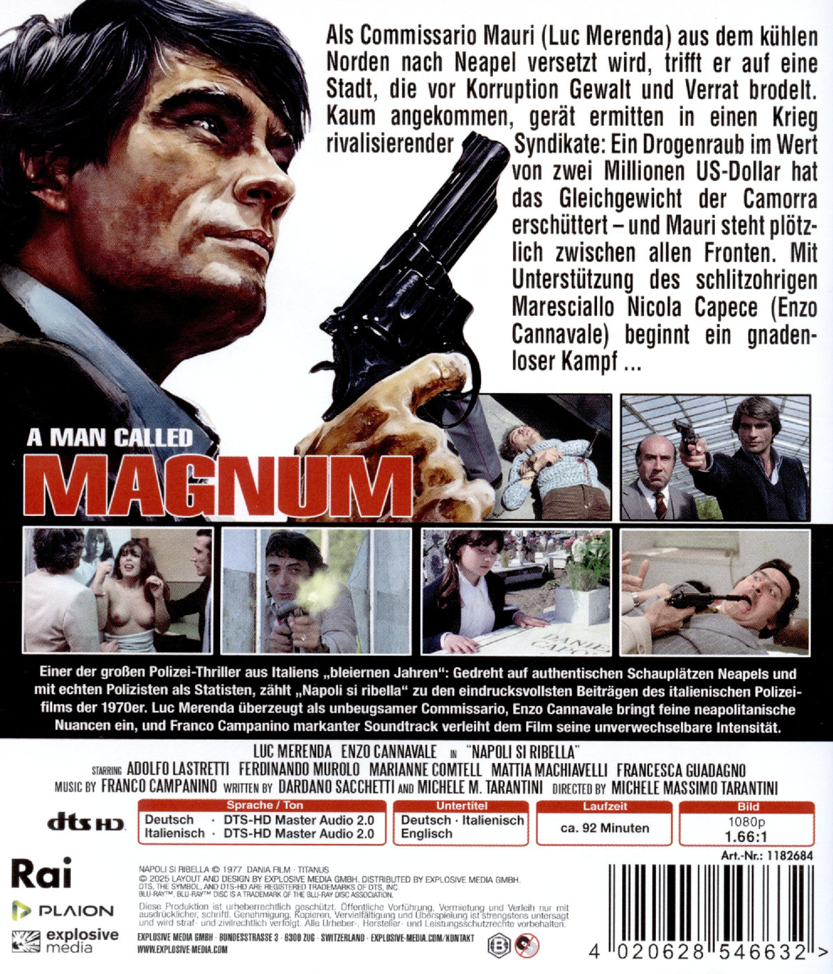 Die Handlung versetzt uns in das pulsierende, von Kriminalität durchzogene Neapel, wo Commissario Mauri aus Mailand ankommt, um dem organisierten Verbrechen den Kampf anzusagen. Ein gestohlener Drogenvorrat im Wert von zwei Millionen Dollar löst eine Kette von Ereignissen aus, die Mauri und seinen Partner, den charismatischen Maresciallo Nicola Capece (Enzo Cannavale), auf eine gefährliche Mission führen. Die Stadt selbst wird zur Bühne für atemlose Verfolgungsjagden und explosive Konfrontationen, wobei Tarantini die Kulisse Neapels meisterhaft nutzt, um die raue Atmosphäre des Films zu unterstreichen. „A Man Called Magnum“ ist ein Muss für Fans des italienischen Genrekinos. Luc Merenda liefert eine starke Performance, die von Tarantinis dynamischer Regie und einem packenden Soundtrack unterstützt wird. Trotz kleiner Schwächen in der Handlung – die zuweilen bekannten Pfaden folgt – überzeugt der Film durch seine Action, die starken Charaktere und die atmosphärische Darstellung Neapels. Für Liebhaber von Poliziotteschi ist dieser Film ein echtes Highlight, das die Essenz des Genres einfängt: roh, kompromisslos und unglaublich unterhaltsam.