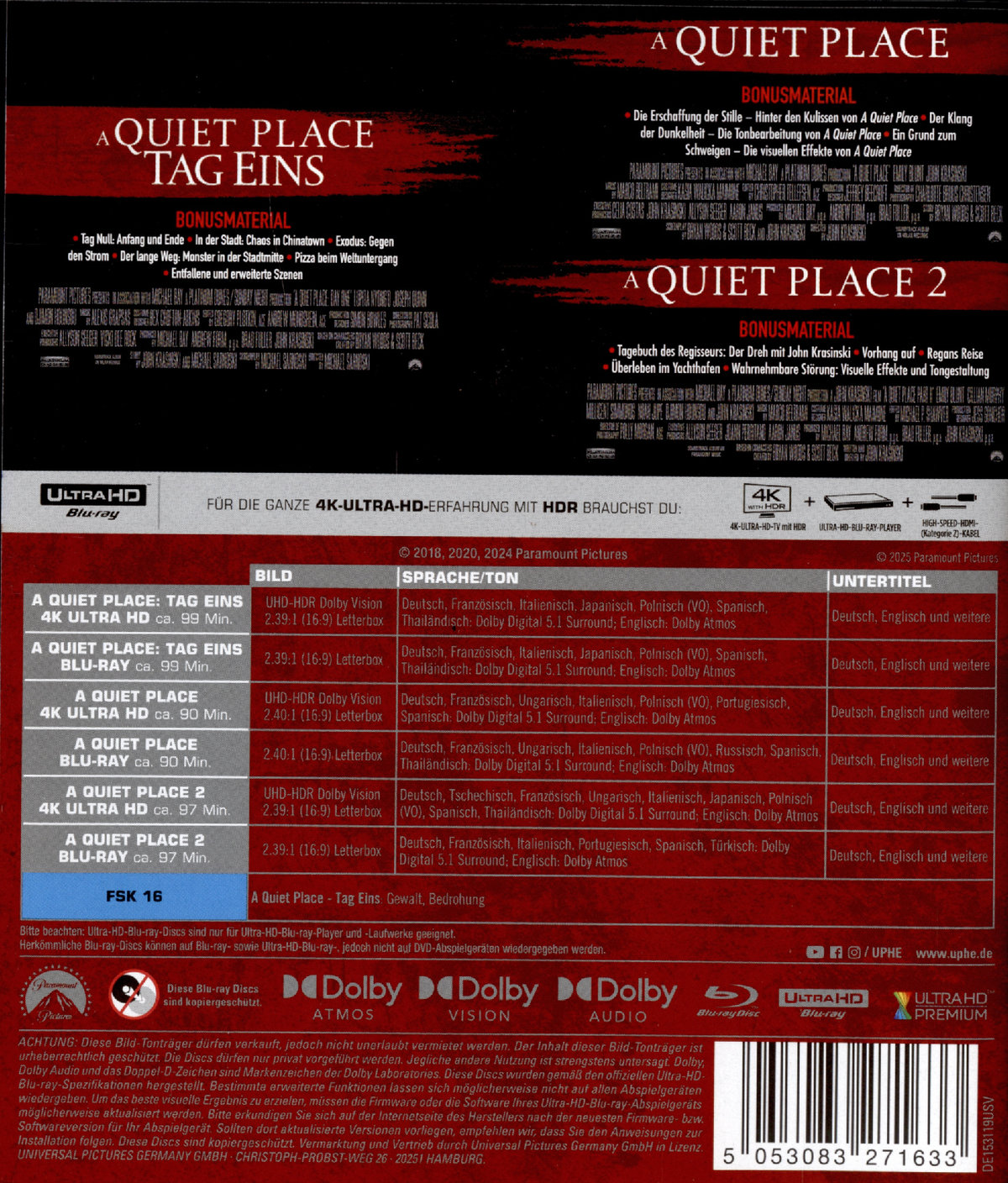 Enthält 6 Discs: 3 x 4K UHD & 3 x Blu-ray,Tag Null: Anfang und Ende,Exodus: Gegen den Strom,Entfallene und erweiterte Szenen,Hinter den Kulissen von "A Quiet Place", Tagebuch des Regisseurs,Visuelle Effekte und Tongestaltung,u.v.m.