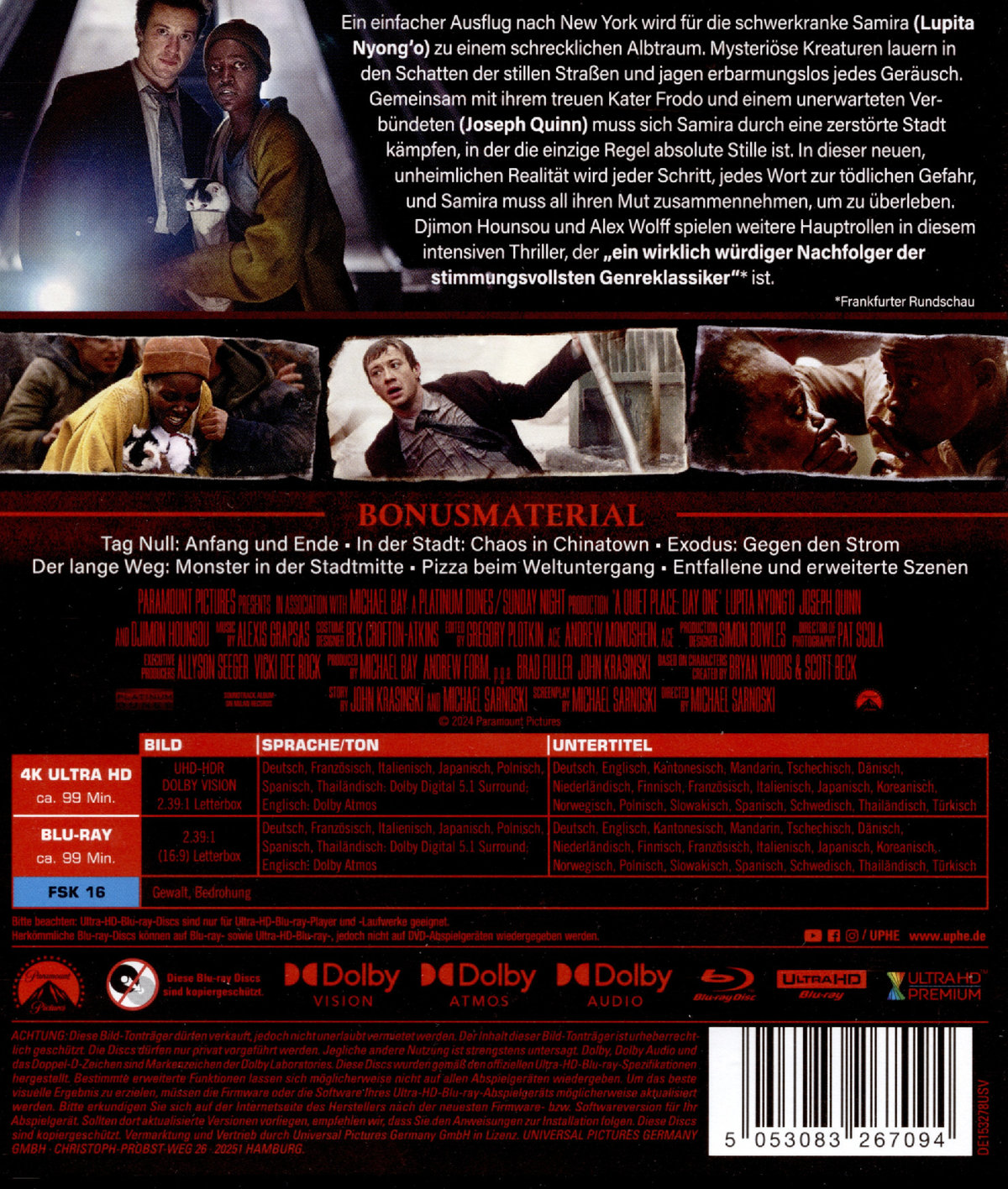 Ein einfacher Ausflug nach New York wird für die schwerkranke Samira (Lupita Nyong'o) zu einem schrecklichen Albtraum. Mysteriöse Kreaturen lauern in den Schatten der stillen Straßen und jagen erbarmungslos jedes Geräusch. Gemeinsam mit ihrem treuen Kater Frodo und einem unerwarteten Verbündeten (Joseph Quinn) muss sich Samira durch eine zerstörte Stadt kämpfen, in der die einzige Regel absolute Stille ist. In dieser neuen, unheimlichen Realität wird jeder Schritt, jedes Wort zur tödlichen Gefahr, und Samira muss all ihren Mut zusammennehmen, um zu überleben. Djimon Hounsou und Alex Wolff spielen weitere Hauptrollen in diesem intensiven Triller, der "ein wirklich würdiger Nachfolger der stimmungsvollsten Genreklassiker" ist. (Frankfurter Rundschau)"Richtig gelungene Sci-Fi-Horror-Rückkehr" (Moviepilot.de)