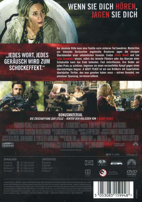 Die Welt ist von rätselhaften, scheinbar unverwundbaren Kreaturen eingenommen worden, die durch jedes noch so kleine Geräusch angelockt werden und sich auf die Jagd begeben… Lediglich einer einzigen Familie gelang es bisher zu überleben. Der Preis hierfür ist jedoch hoch: Ihr gesamter Alltag ist darauf ausgerichtet, sich vollkommen lautlos zu verhalten, denn das kleinste Geräusch könnte ihr Ende bedeuten...