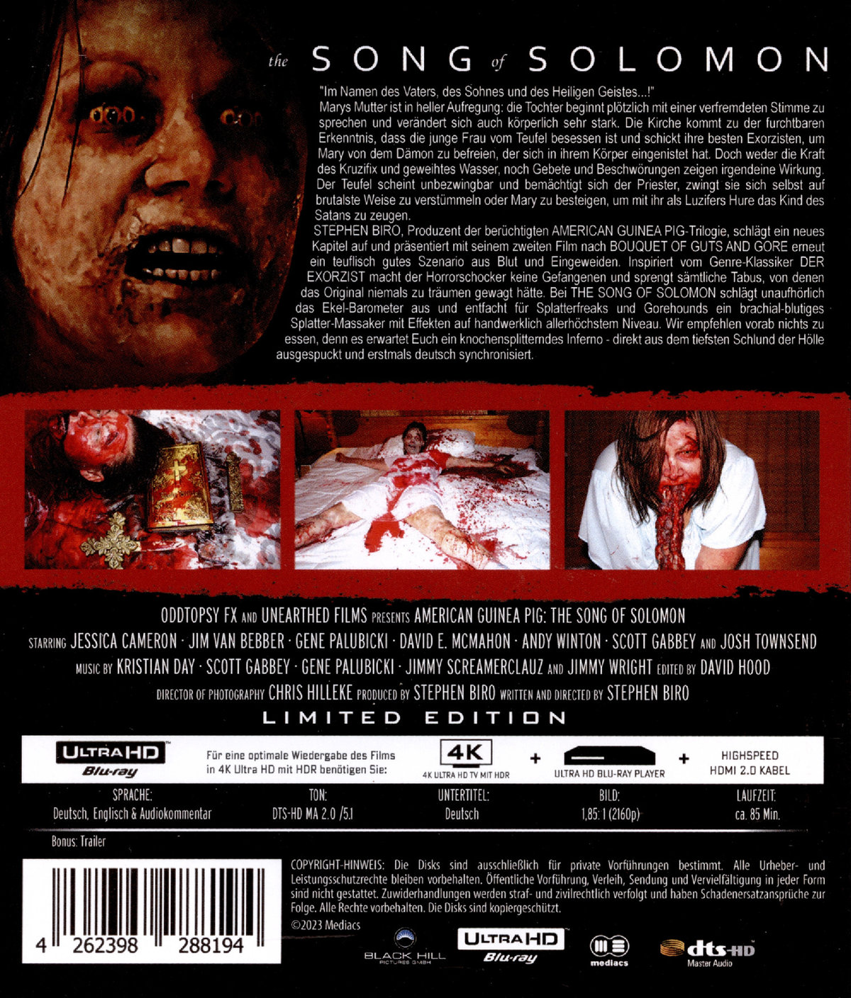 Im Namen des Vaters, des Sohnes und des Heiligen Geistes...!" Marys Mutter ist in heller Aufregung: die Tochter beginnt plötzlich mit einer verfremdeten Stimme zu sprechen und verändert sich auch körperlich sehr stark. Die Kirche kommt zu der furchtbaren Erkenntnis, dass die junge Frau vom Teufel besessen ist und schickt ihre besten Exorzisten, um Mary von dem Dämon zu befreien, der sich in ihrem Körper eingenistet hat. Doch weder die Kraft des Kruzifix und geweihtes Wasser, noch Gebete und Beschwörungen zeigen irgendeine Wirkung. Der Teufel scheint unbezwingbar und bemächtigt sich der Priester, zwingt sie sich selbst auf brutalste Weise zu verstümmeln oder Mary zu besteigen, um mit ihr als Luzifers Hure das Kind des Satans zu zeugen. STEPHEN BIRO, Produzent der berüchtigten AMERICAN GUINEA PIC-Trilogie, schlägt ein neues Kapitel auf und präsentiert mit seinem zweiten Film nach BOUQUET OF GUTS AND GORE erneut ein teuflisch gutes Szenario aus Blut und Eingeweiden. Inspiriert vom Genre-Klassiker DER EXORZIST macht der Horrorschocker keine Gefangenen und sprengt sämtliche Tabus, von denen das Original niemals zu träumen gewagt hätte. Bei THE SONG OF SOLOMON schlägt unaufhörlich das Ekel-Barometer aus und entfacht für Splatterfreaks und Gorehounds ein brachial-blutiges Splatter-Massaker mit Effekten auf handwerklich allerhöchstem Niveau. Wir empfehlen vorab nichts zu essen, denn es erwartet Euch ein knochensplitterndes Inferno - direkt aus dem tiefsten Schlund der Hölle ausgespuckt und erstmals deutsch synchronisiert