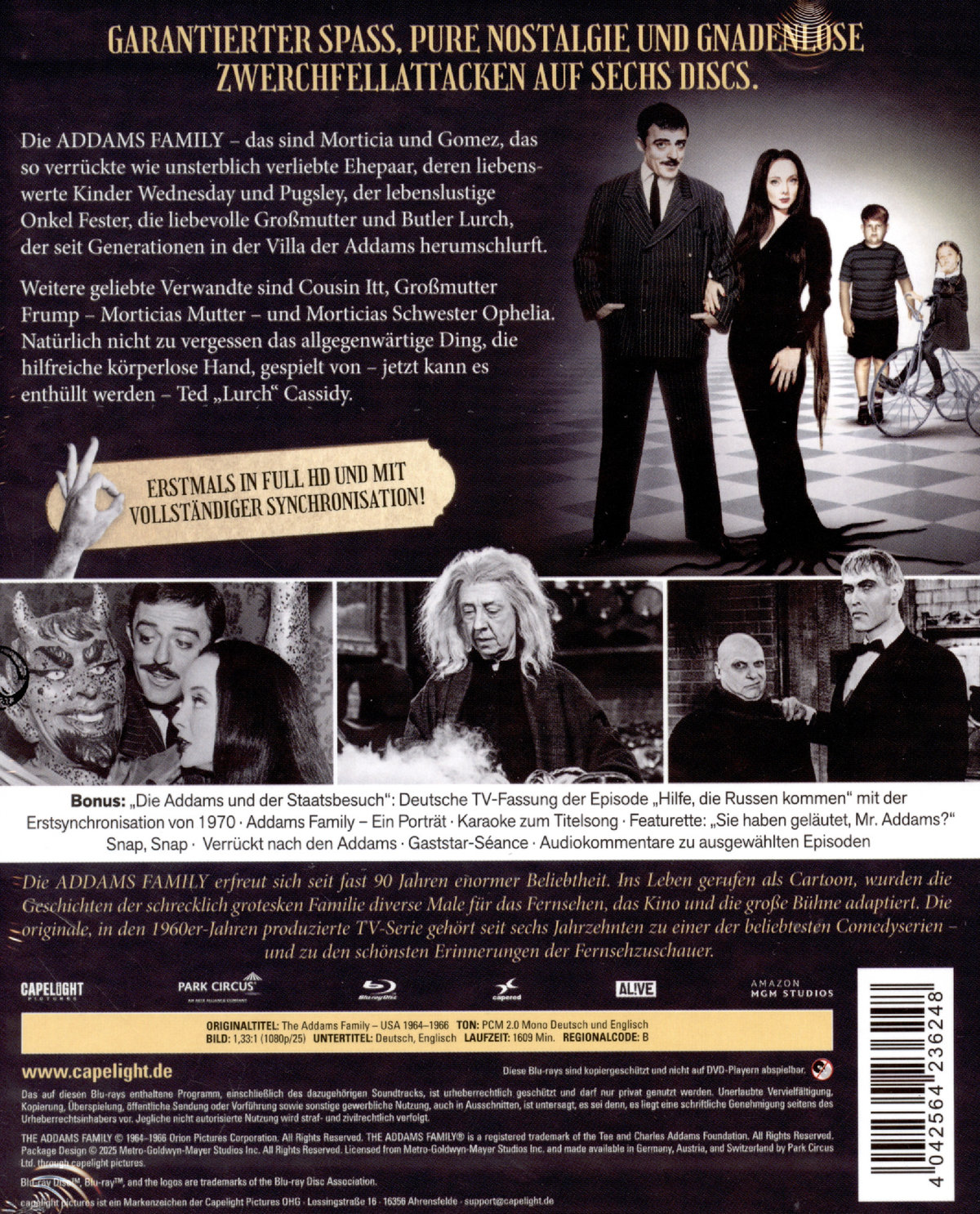 Die ADDAMS FAMILY – das sind Morticia und Gomez, das so verrückte wie unsterblich verliebte Ehepaar, deren liebenswerte Kinder Wednesday und Pugsley, der lebenslustige Onkel Fester, die liebevolle Großmutter und Butler Lurch, der seit Generationen in der Villa der Addams herumschlurft. Weitere geliebte Verwandte sind Cousin Itt, Großmutter Frump – Morticias Mutter – und Morticias Schwester Ophelia. Natürlich nicht zu vergessen das allgegenwärtige Ding, die hilfreiche körperlose Hand, gespielt von – jetzt kann es enthüllt werden – Ted "Lurch" Cassidy. Unvergesslich: Gomez' Reaktionen auf Morticias Französisch; Lurchs berühmtes "Sie haben geläutet?", wenn die Familie an der Schnur zieht, um Lurchs Dienste in Anspruch zu nehmen; Lurchs eigenes Cembalospiel; das Haustier der Familie, Kitty Kat, ein liebenswerter alter Löwe; das Familienauto, ein alter Packard-Tourenwagen usw. Die ADDAMS FAMILY erfreut sich seit fast 90 Jahren enormer Beliebtheit. Ins Leben gerufen als Cartoon, wurden die Geschichten der schrecklich grotesken Familie diverse Male für das Fernsehen, das Kino und die große Bühne adaptiert. Die originale, in den 1960er-Jahren produzierte TV-Serie gehört seit sechs Jahrzehnten zu einer der beliebtesten Comedyserien – und zu den schönsten Erinnerungen der Fernsehzuschauer. Diese Edition beinhaltet neben garantiertem Spaß auch noch pure Nostalgie und gnadenlose Zwerchfellattacken auf sechs Discs.