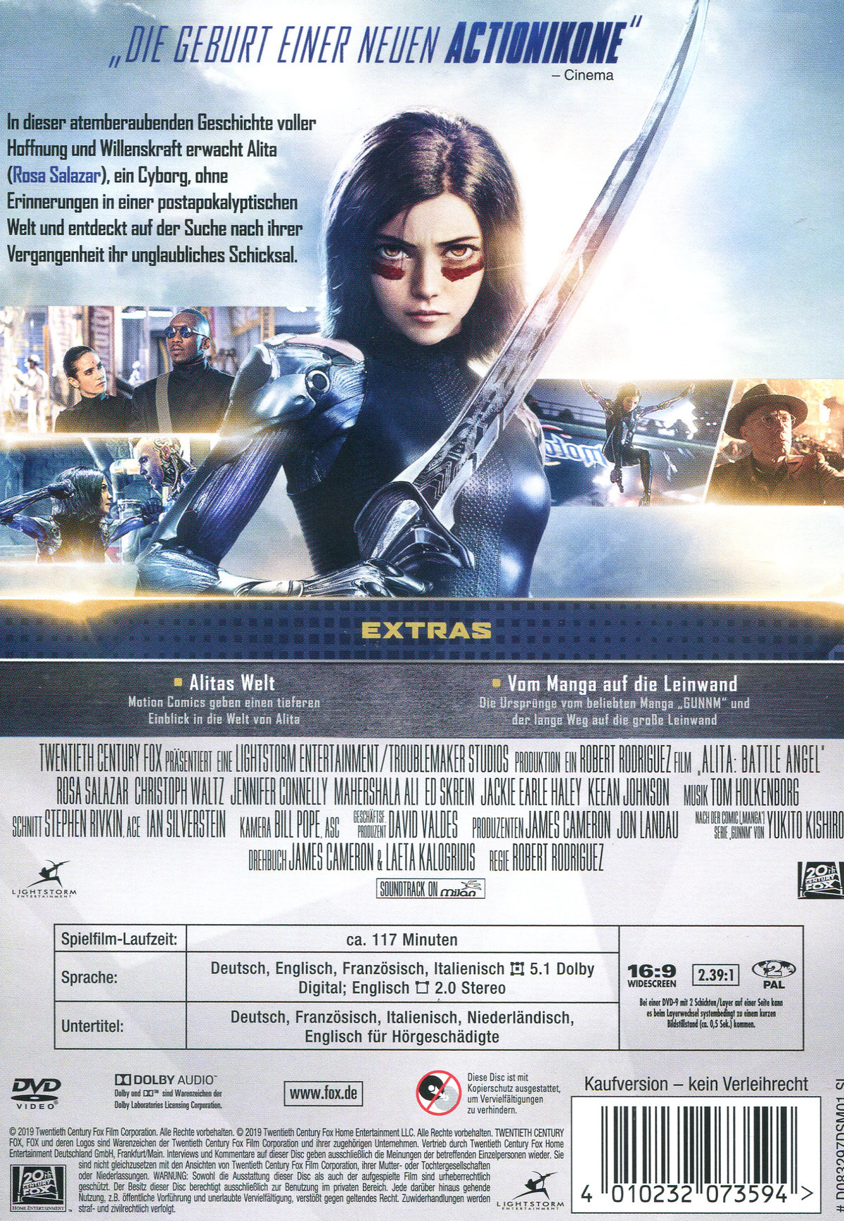 Als Alita (Rosa Salazar) ohne jede Erinnerung daran, wer sie ist, in einer fremden Welt der Zukunft erwacht, wird sie von Ido (Christoph Waltz) aufgenommen. Der mitfühlende Arzt erkennt, dass sich hinter der leeren Cyborg-Hülle das Herz und die Seele einer jungen Frau mit einer außergewöhnlichen Vergangenheit verbergen. Während Alita lernt, sich in ihrem neuen Leben und den gefährlichen Straßen von Iron City zurechtzufinden, versucht Ido sie vor ihrer geheimnisvollen Vergangenheit zu beschützen. Ganz im Gegensatz zu ihrem neuen gerissenen Freund Hugo (Keean Johnson), der ihr dabei helfen will, ihre Erinnerungen wiederherzustellen. Aber erst als die todbringenden und korrupten Mächte, die die Stadt beherrschen, Alita ins Visier nehmen, erhält sie einen Hinweis auf ihre Vergangenheit: Sie verfügt über einzigartige Kampfkünste, die die Herrschenden um jeden Preis kontrollieren wollen. Wenn es ihr gelingt, sich von ihnen fernzuhalten, könnte sie der Schlüssel sein, um ihre Freunde, ihre Familie und die Welt, die ihr ans Herz gewachsen ist, zu retten.