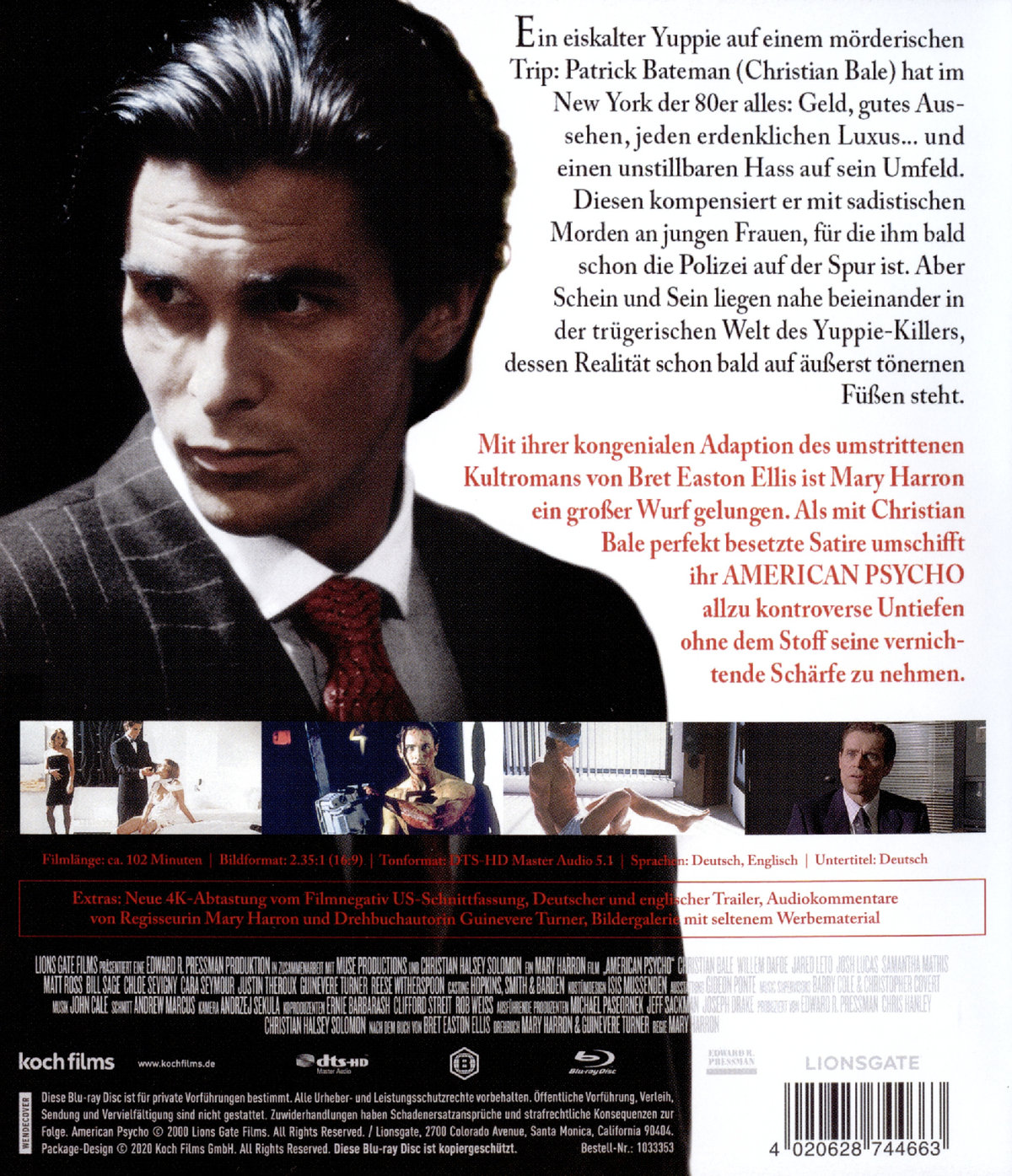 Ein eiskalter Yuppie auf einem mörderischen Trip: Patrick Bateman (Christian Bale) hat im New York der 80er alles: Geld, gutes Aussehen, jeden erdenklichen Luxus... und einen unstillbaren Hass auf sein Umfeld. Diesen kompensiert er mit sadistischen Morden an jungen Frauen, für die ihm bald schon die Polizei auf der Spur ist. Aber Schein und Sein liegen nahe beieinander in der trügerischen Welt des Yuppie-Killers, dessen Realität schon bald auf äußerst tönernen Füßen steht. (Blu-ray)