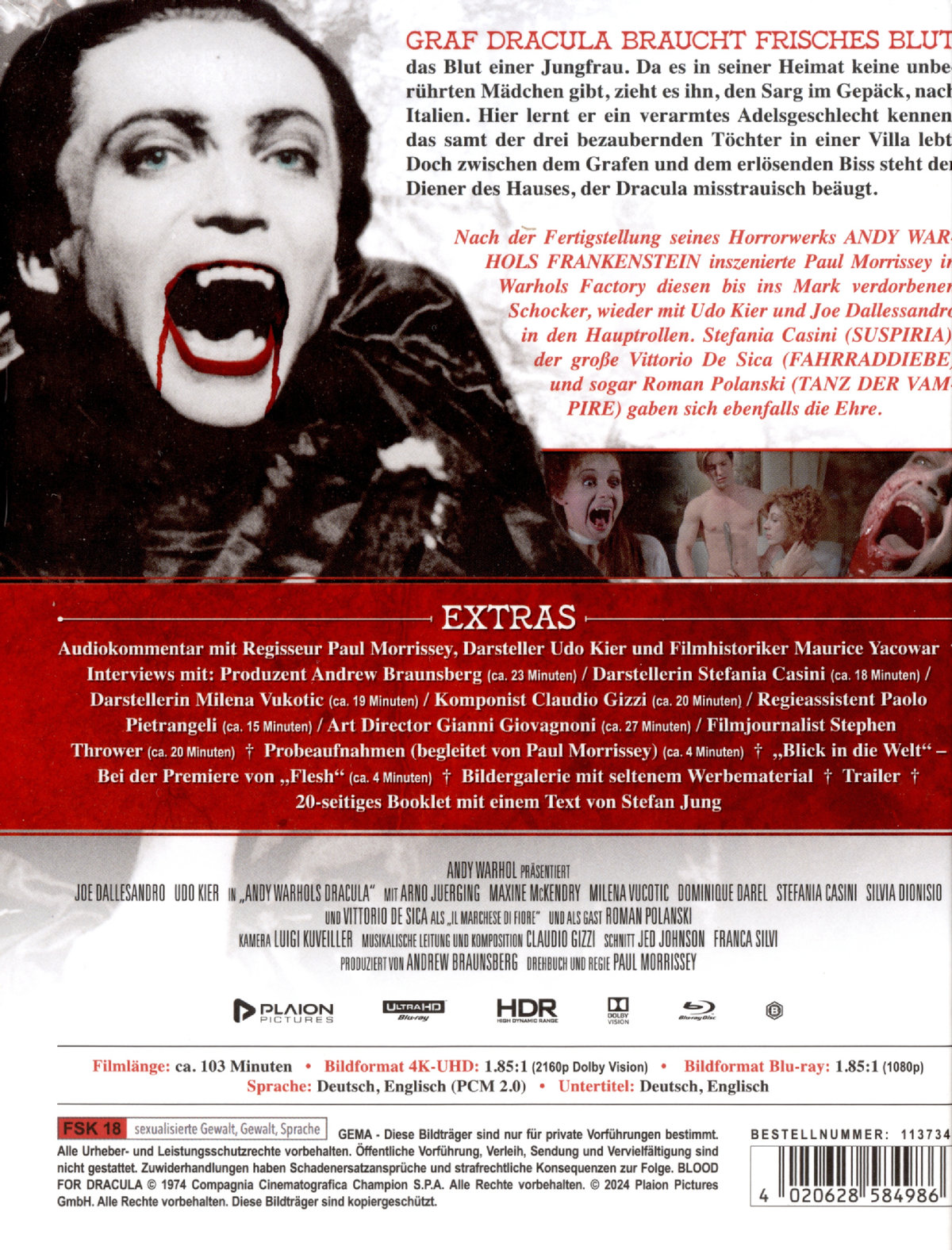 Nach der Fertigstellung seines Horrorwerks ANDY WARHOLS FRANKENSTEIN inszenierte Paul Morrissey in Warhols Factory diesen bis ins Mark verdorbenen Schocker, wieder mit Udo Kier und Joe Dallessandro in den Hauptrollen. Stefania Casini (SUSPIRIA), der große Vittorio De Sica (FAHRRADDIEBE) und sogar Roman Polanski (TANZ DER VAMPIRE) gaben sich ebenfalls die Ehre.