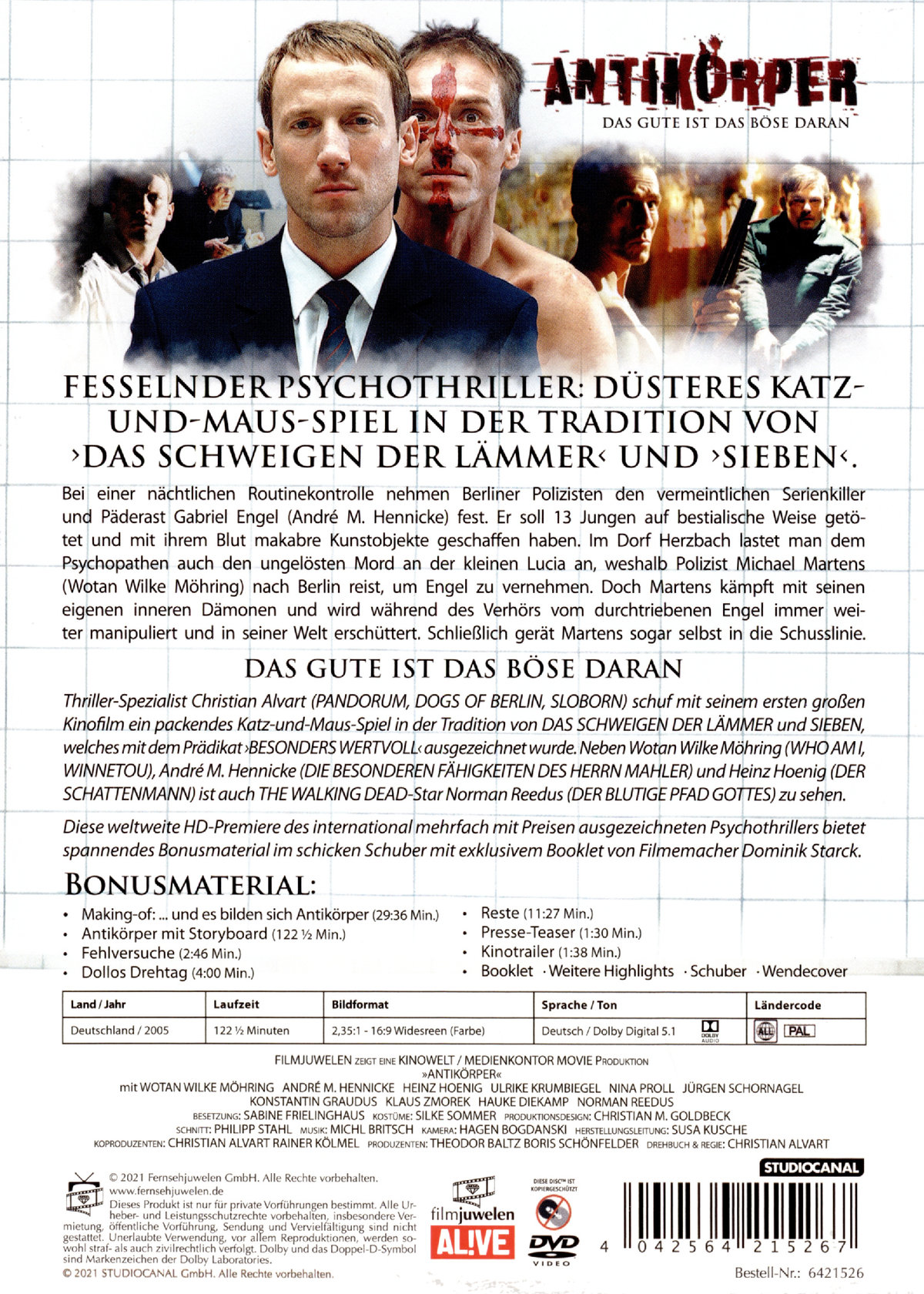 - "Antikörper" ist (…) eine Klasse für sich. Was ihm an internationaler Starpower und Big Budget Optik fehlen mag, gleicht er mit schauspielerischen Höchstleistungen, fantasievollen Bildkompositionen, pointierter Symbolik und vor allem durch ein exzellentes Drehbuch aus. Da krallen sich selbst hartgesottene Zuschauer in ihren Sitzen fest. Fazit: Der psychologisch radikalste und konsequenteste Thriller, der jemals in Deutschland entstand." - (Cinema)