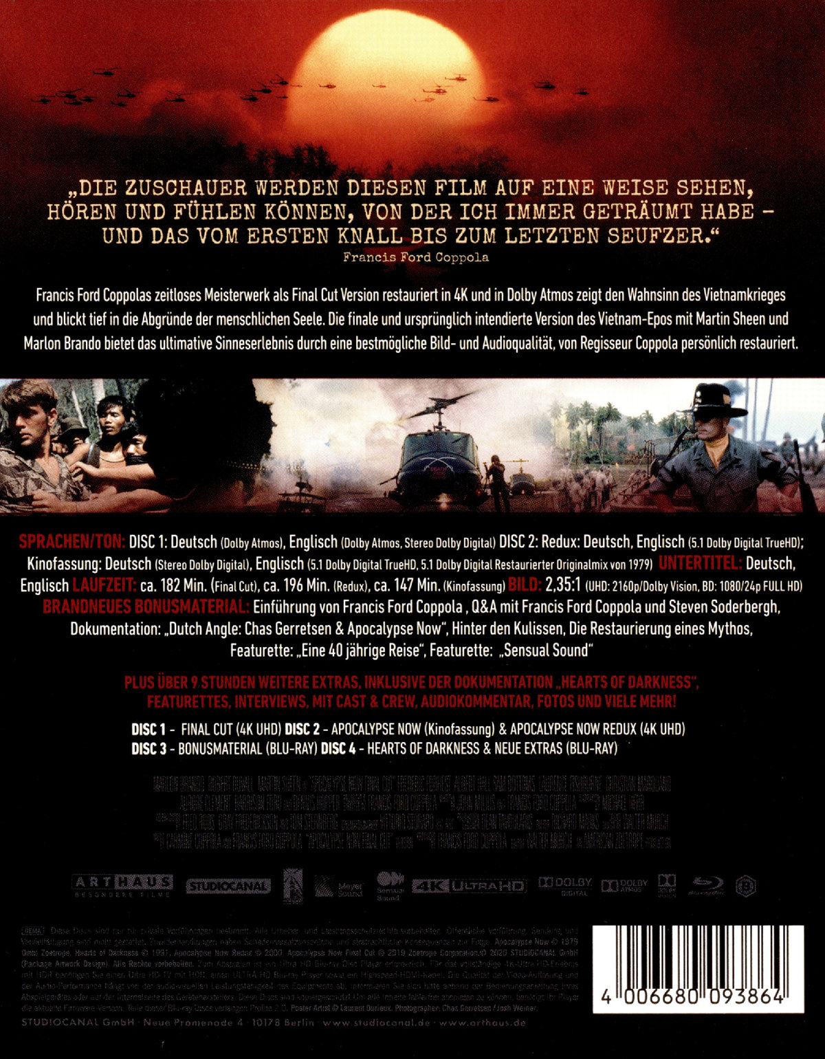 Einführung von Francis Ford Coppola, Audiokommentar mit Francis Ford Coppola (Redux), Interview mit John Milius, Ein Gespräch mit Martin Sheen und Francis Ford Coppola, Fred Roos: Casting Apocalypse, Radiosendung "Mercury Theatre on the air", Die verlorene Szene: Affen auf dem Sampan, Zusätzliche Szenen, Zerstörung des Camps von Kurtz mit Credits, Die Entstehung des 5.1 Sounds, Geister-Helikopter-Flugszene, Apocalypse Now: Der Sythesizer- Soundtrack von Bob Moog, Eine Million Meter: Der Schnitt von Apocalypse Now, Die Musik von Apocalypse Now, Kürzlich irgendwelche guten Filme gehört?, Die endgültige Mischung, Apocalypse damals und heute, Filmfestival Cannes, 2001: Francis Ford Coppola, Strassengang auf dem Boot, Die Farbpalette von Apocalypse Now, Audiokommentar von Francis Ford und Eleanor Coppola, Auszug aus dem Drehbuch von John Milius, Storyboard-Sammlung, Fotoarchiv, PR-Archiv, + Dokumentation "Hearts of Darkness"