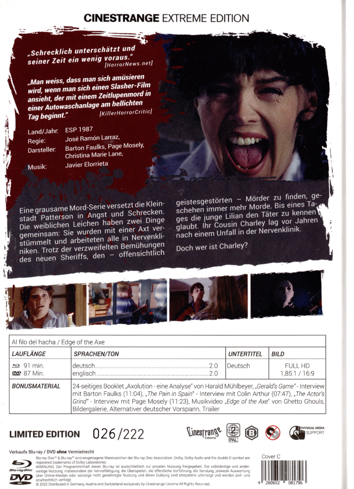 INHALT: Die ländliche Gemeinde Paddock County wird von den verrückten Taten eines axtschwingenden Psychopathen erschüttert, der in einem schwarzen Trenchcoat, einer Maske und einem Beil durch die Nacht streift. Während sich die Opfer häufen, versuchen die Behörden, die Situation unter Kontrolle zu halten, während das Computergenie Gerald und seine Freundin Lillian versuchen, den Mörder zu entlarven, bevor die Einwohnerzahl der Stadt auf Null sinkt. Der Film hat Nordkalifornien als Setting, wurde aber hauptsächlich in Madrid - mit überwiegend amerikanischem Cast - gedreht, was dem Film eine schräge, amerikanisch-europäische Atmosphäre verleiht, die an Filme wie PIECES erinnert. AXOLUTION ist ein spätes Hack-and-Slash-Meisterwerk von einem der Titanen des spanischen Terrors, nämlich dem spanischen Kultfilmemacher José Ramón Larraz (Vampyres, Symptoms). AXOLUTION ist ein sträflich vernachlässigter Slasher-Klassiker aus den späten 80er Jahren, der hierzulande erstmals überhaupt auf einem digitalen Format erscheint, restauriert vom 2K Negativ. Die Interviews bieten sehr interessante Einblicke in den Dreh, und Special FX-Legende Colin Arthur (CONAN) erklärt ausführlich, wie er einen Splatter-Effekt realisiert hat. "Schrecklich unterschätzt und seiner Zeit ein wenig voraus" [HorrorNews] "Man weiss, dass man sich amüsieren wird, wenn man sich einen Slasher-Film ansieht, der mit einem Zeitlupenmord in einer Autowaschanlage am hellichten Tag beginnt" [Killer Horror Critic]