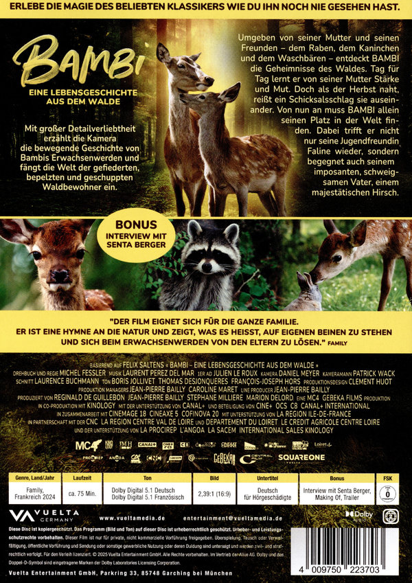 Umgeben von seiner Mutter und den Tieren des Waldes: seinem Freund, dem Raben, dem Kaninchen und dem Waschbären entdeckt BAMBI die Welt der Bäume und ihre Geheimnisse. Tag für Tag lernt er von seiner Mutter, Stärke und Mut zu entwickeln. Doch als der Herbst naht, reißt ein jäher Schicksalsschlag sie auseinander. Von nun an muss BAMBI allein bestehen, sich seinen Platz in der Welt erkämpfen. Dabei findet er nicht nur seine Jugendfreundin Faline, sondern trifft schließlich auch auf seinen imposanten, schweigsamen Vater – einen majestätischen Hirsch. Mit großer Detailverliebtheit fängt die Kamera die Welt gefiederter, bepelzter und geschuppter Waldbewohner ein und erzählt die bewegende Geschichte von Bambis Weg ins Erwachsenenleben.