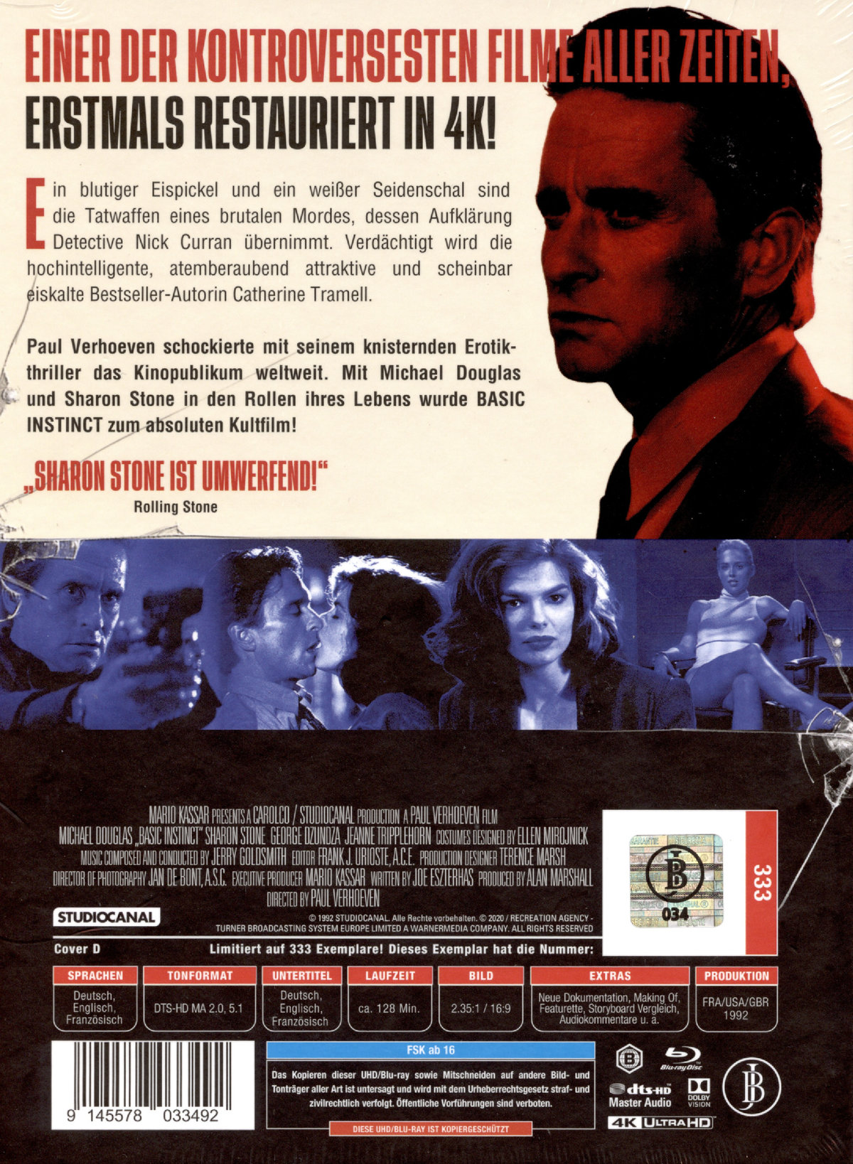 Ein blutiger Eispickel und ein weißer Seidenschal sind die Tatwaffen eine brutalen Mordes, dessen Aufklärung Detective Nick Curran übernimmt. Verdächtigt wied die hochintelligente, atemberaubende attraktive und scheinbar eiskalte Bestseller-Autorin Catherine Tramell. 1992 schockierte Regisseur Paul Verhoeven mit seinem knisternden Erotikthriller die Kinobesucher weltweit. Mit Michael Douglas und Sharon Stone in den Rollen ihres Lebens hat Verhoevens BASIC INSTINCT das Subgenre des erotischen Thrillers neu definiert und avancierte, nicht nur wegen seiner freizügigen Inszenierung, über die Jahre zum absoluten Kultfilm und einem der heiß diskutiertesten Skandalfilme aller Zeiten. Auch fast dreißig Jahre später fasziniert und unterhält der Film dank seiner psychologisch komplizierten Charaktere und einer immer noch potenten Mischung aus klassischer Noir-Geschichte und gewagtem Sex- und Gewaltlevel. In weiteren Rollen zu sehen sind Jeanne Tripplehorn als Polizeipsychologin Dr. Beth Garner, George Dzundas als Nicks Partner Gus, Denis Arndt als Lieutenant Phillip Walker und Leilani Sarelle als Roxy Hardy. Abgerundet wird die Besetzung durch großartige Charakterdarsteller wie Bruce A. Young, Stephen Tobolowsky, Wayne Knight und Chelcie Ross. (1 4K Ultra HD + 1 Blu-ray) Paul Verhoeven schockierte mit seinem knisternden Erotikthriller das Kinopublikum weltweit. Mit Michael Douglas und Sharon Stone in den Rollen ihres Lebens wurde BASIC INSTINCT zum absoluten Kultfilm!