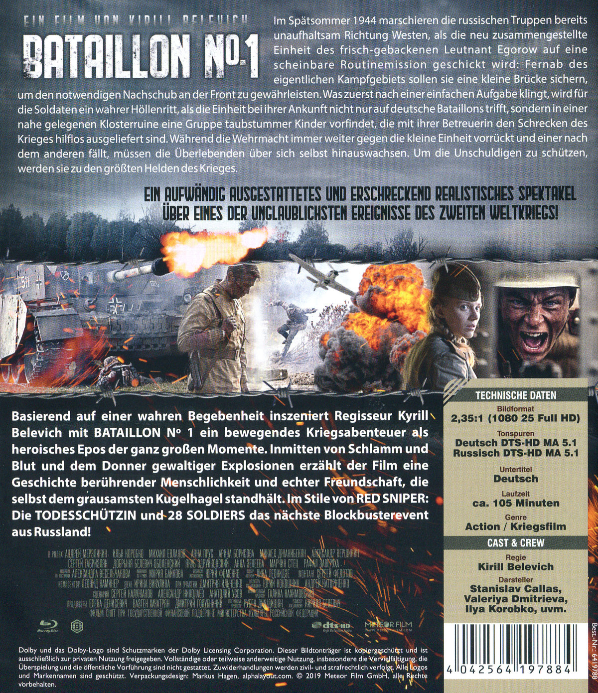Im Spätsommer 1944 marschieren die russischen Truppen bereits unaufhaltsam Richtung Westen, als die neu zusammengestellte Einheit des frischgebackenen Leutnant Egorow auf eine scheinbare Routinemission geschickt wird: Fernab des eigentlichen Kampfgebiets sollen sie eine kleine Brücke sichern, um den notwendigen Nachschub an der Front zu gewährleisten. Was zuerst nach einer einfachen Aufgabe klingt, wird für die Soldaten ein wahrer Höllenritt, als die Einheit bei ihrer Ankunft nicht nur auf deutsche Bataillons trifft, sondern in einer nahe gelegenen Klosterruine eine Gruppe taubstummer Kinder vorfindet, die mit ihrer Betreuerin den Schrecken des Krieges hilflos ausgeliefert sind. Während die Wehrmacht immer weiter gegen die kleine Einheit vorrückt und einer nach dem anderen fällt, müssen die Überlebenden über sich selbst hinauswachsen. Um die Unschuldigen zu schützen, werden sie zu den größten Helden des Krieges. Basierend auf einer wahren Begebenheit inszeniert Regisseur Kyrill Belevich mit BATAILLON Nº 1 ein bewegendes Kriegsabenteuer als heroisches Epos der ganz großen Momente. Inmitten von Schlamm und Blut und dem Donner gewaltiger Explosionen erzählt der Film eine Geschichte berührender Menschlichkeit und echter Freundschaft, die selbst dem grausamsten Kugelhagel standhält. Ein aufwändig ausgestattetes und erschreckend realistisches Spektakel über eines der unglaublichsten Ereignisse des zweiten Weltkriegs!