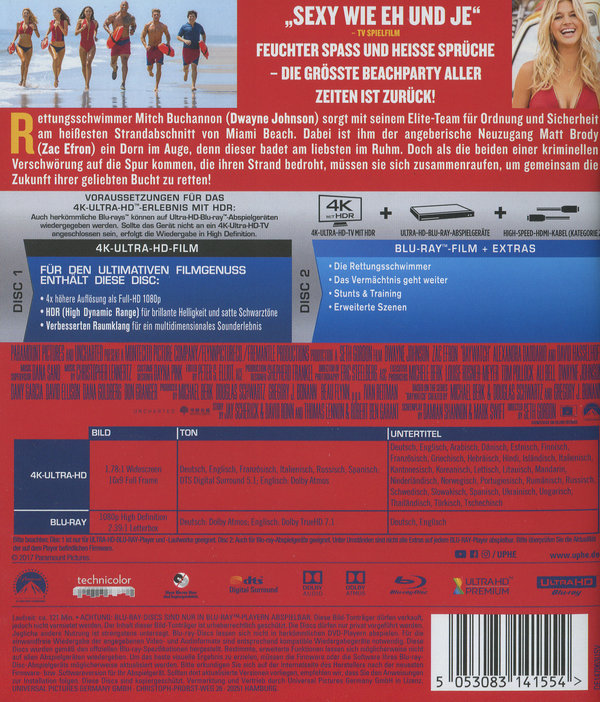 Darsteller: Dwayne Johnson, Zac Efron, Alexandra Daddario, Kelly Rohrbach, Priyanka Chopra, Jon Bass, Ilfenesh Hadera, Yahya Abdul-Mateen II, David Hasselhoff, Pamela Anderson