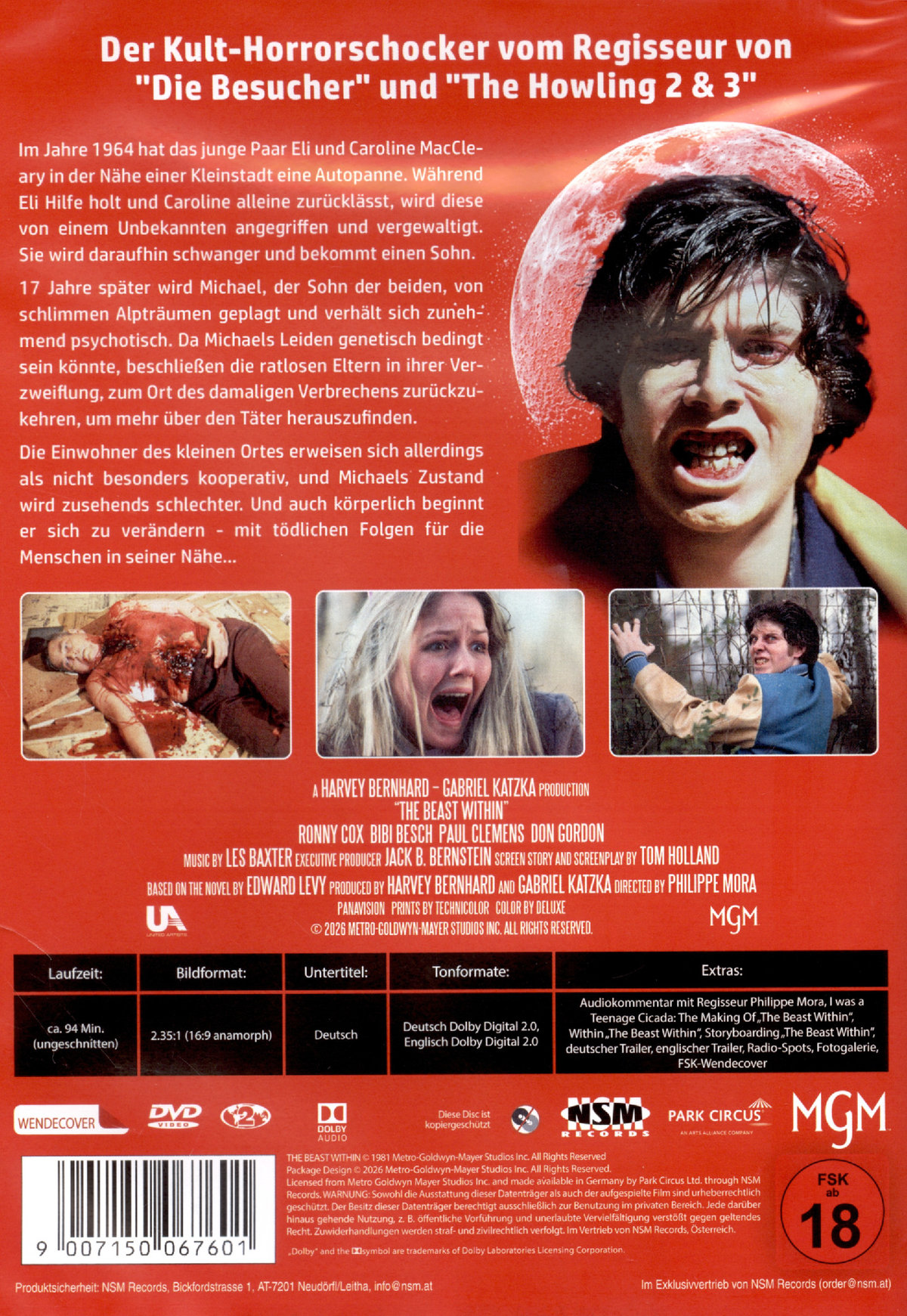 Audiokommentar mit Regisseur Philippe Mora (Englisch ohne Untertitel); I was a Teenage Cicada: The Making Of "The Beast Within“ (Englisch mit optionalen deutschen Untertiteln) [BD only]; Within "The Beast Within“ (Englisch mit optionalen deutschen Untertiteln); Storyboarding "The Beast Within"“ (Englisch mit optionalen deutschen Untertiteln); Deutscher Trailer; Englischer Trailer; Radio-Spots; Fotogalerie