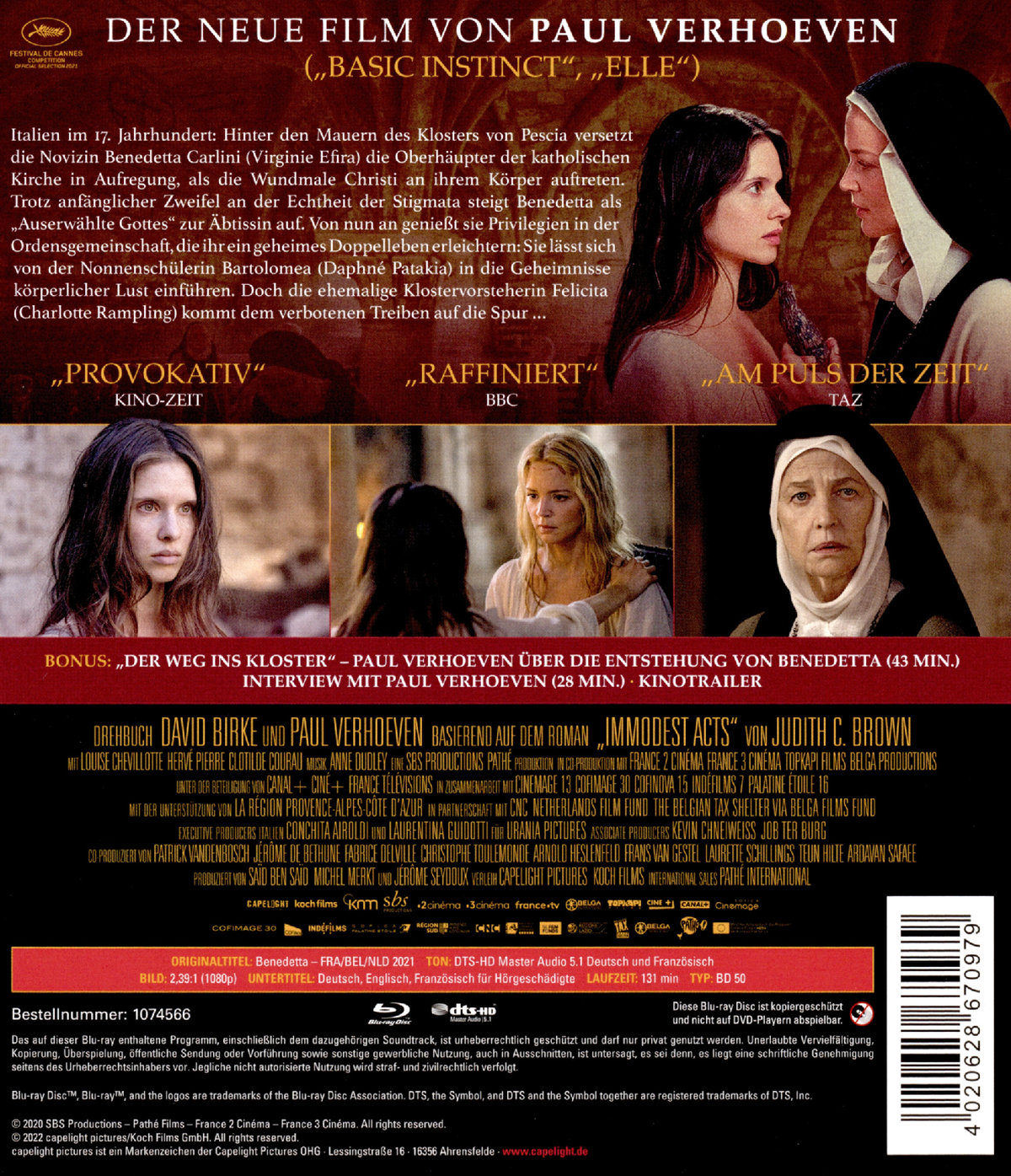 Italien im 17. Jahrhundert: Hinter den Mauern des Klosters von Pescia versetzt die Novizin Benedetta Carlini (Virginie Efira) die Oberhäupter der katholischen Kirche in Aufregung, als die Wundmale Christi an ihrem Körper auftreten. Trotz anfänglicher Zweifel an der Echtheit der Stigmata steigt Benedetta als „Auserwählte Gottes“ zur Äbtissin auf. Von nun an genießt sie Privilegien in der Ordensgemeinschaft, die ihr ein geheimes Doppelleben erleichtern: Sie lässt sich von der Nonnenschülerin Bartolomea (Daphné Patakia) in die Geheimnisse körperlicher Lust einführen. Doch die ehemalige Klostervorsteherin Felicita (Charlotte Rampling) kommt dem verbotenen Treiben auf die Spur …
