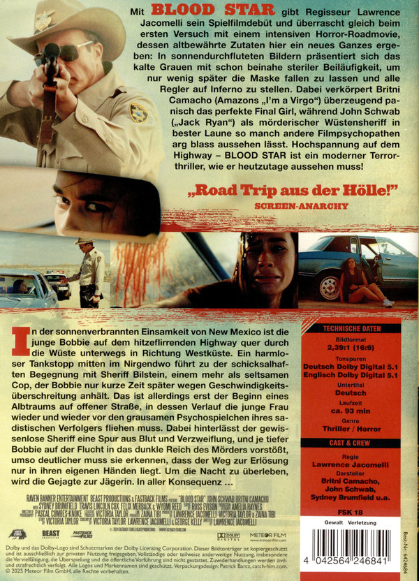 In der sonnenverbrannten Einsamkeit von New Mexico ist die junge Bobbie auf dem hitzeflirrenden Highway quer durch die Wüste unterwegs in Richtung Westküste. Ein harmloser Tankstopp mitten im Nirgendwo führt zu der schicksalhaften Begegnung mit Sheriff Bilstein, einem mehr als seltsamen Cop, der Bobbie nur kurze Zeit später wegen Geschwindigkeitsüberschreitung anhält. Das ist allerdings erst der Beginn eines Albtraums auf offener Straße, in dessen Verlauf die junge Frau wieder und wieder vor den grausamen Psychospielchen ihres sadistischen Verfolgers fliehen muss. Dabei hinterlässt der gewissenlose Sheriff eine Spur aus Blut und Verzweiflung, und je tiefer Bobbie auf der Flucht in das dunkle Reich des Mörders vorstößt, umso deutlicher muss sie erkennen, dass der Weg zur Erlösung nur in ihren eigenen Händen liegt. Um die Nacht zu überleben, wird die Gejagte zur Jägerin. In aller Konsequenz … MIT BLOOD STAR gibt Regisseur Lawrence Jacomelli sein Spielfilmdebüt und überrascht gleich beim ersten Versuch mit einem intensiven Horror-Roadmovie, dessen altbewährte Zutaten hier ein neues Ganzes ergeben: In sonnendurchfluteten Bildern präsentiert sich das kalte Grauen mit schon beinahe steriler Beiläufigkeit, um nur wenig später die Maske fallen zu lassen und alle Regler auf Inferno zu stellen. Dabei verkörpert Britni Camacho (Amazons „I’m a Virgo“) überzeugend panisch das perfekte Final Girl, während John Schwab („Jack Ryan“) als mörderischer Wüstensheriff in bester Laune so manch andere Filmpsychopathen arg blass aussehen lässt. Hochspannung auf dem Highway – BLOOD STAR ist ein moderner Terrorthriller, wie er heutzutage aussehen muss!