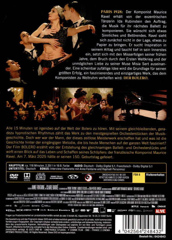 Paris 1928: Der Komponist Maurice Ravel erhält von der exzentrischen Tänzerin Ida Rubinstein den Auftrag, die Musik für ihr nächstes Ballett zu komponieren. Sie wünscht sich etwas Sinnliches und Betörendes. Ravel sieht sich zunächst nicht in der Lage, etwas zu Papier zu bringen. Er sucht Inspiration in seinem Alltag und taucht tief in sein Innerstes ein, setzt sich mit den Misserfolgen seiner frühen Jahre, dem Bruch durch den Ersten Weltkrieg und der unmöglichen Liebe zu seiner Muse Misia Sert auseinander. Eine scheinbar zufällige Idee wird die Grundlage für seinen größten Erfolg, ein faszinierendes und einzigartiges Werk, das dem Komponisten zu Weltruhm verhelfen wird: der Bolero.