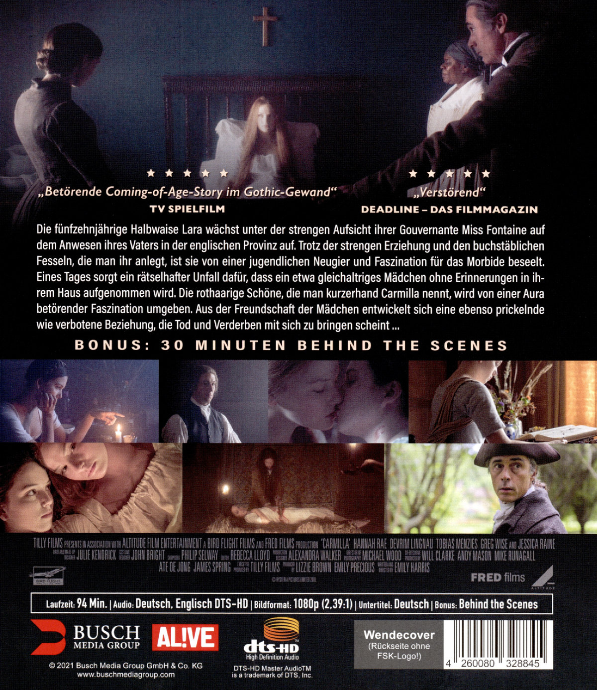 Die grandiose Verfilmung des ersten Vampirromans der Welt ist sinnlicher viktorianischer Gothic Horror: Gepeinigt von ihrem puritanischen Elternhaus gerät ein junges Mädchen in den Bann einer mysteriösen Verführerin. Die 15-jährige Halbwaise Lara wächst unter der strengen Aufsicht ihrer Gouvernante Miss Fontaine auf dem Anwesen ihres Vaters in der englischen Provinz auf. Trotz der strengen Erziehung und den buchstäblichen Fesseln, die man ihr anlegt, ist sie von einer jugendlichen Neugier und Faszination für das Morbide beseelt. Eines Tages sorgt ein rätselhafter Unfall dafür, dass ein etwa gleichaltriges Mädchen ohne Erinnerungen in ihrem Haus aufgenommen wird. Die rothaarige Schöne, die man kurzerhand Carmilla nennt, wird von einer Aura betörender Faszination umgeben. Aus der Freundschaft der Mädchen entwickelt sich eine ebenso prickelnde wie verbotene Beziehung, die Tod und Verderben mit sich zu bringen scheint… Sheridan La Fanus viktorianische Novelle CARMILLA begeisterte und verstörte bereits 25 (!) Jahre vor Bram Stoker’s Dracula mit einer für jene Zeit skandalösen lesbischen Erotik. Die Verfilmung von Regisseurin und Drehbuchautorin Emily Harris fesselt mit dem hypnotischen Spiel seiner Newcomer-Hauptdarstellerinnen und Schauspieler-Veteranen wie Tobias Menzies (Game of Thrones), Greg Wise (The Crown) und Jessica Raine (Call the Midwife - Ruf des Lebens). Für das atmosphärische Produktionsdesign sorgte Alexandra Walker (Harry Potter). Die Kostüme entwarf Oscar-Preisträger John Bright und der stimmungsvolle Soundtrack wurde von Radiohead-Mitglied Philip Selway komponiert.