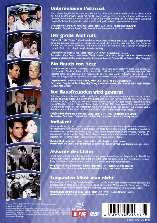 Enthält die Titel: Unternehmen Petticoat (Operation Petticoat) Der Komödienklassiker mit Cary Grant und Tony Curtis! Der Große Wolf ruft (Father Goose) Die legendäre US-Filmkomödie mit Cary Grant und Leslie Caro. Ein Hauch von Nerz (A Touch of Mink) Der Komödienklassiker mit Doris Day und Cary Grant! Vor Hausfreunden wird gewarnt (The Grass is Greener) Cary Grant in der legendären Filmkomödie an der Seite von Topstars wie Deborah Kerr, Robert Mitchum und Jean Simmons Indiskret (Indiscreet) Cary Grant und Ingrid Bergman in der legendären Filmkomödie von Stanley Donen Akkorde der Liebe (Penny Serenade) Cary Grant und Irene Dunne in der legendären Filmkomödie