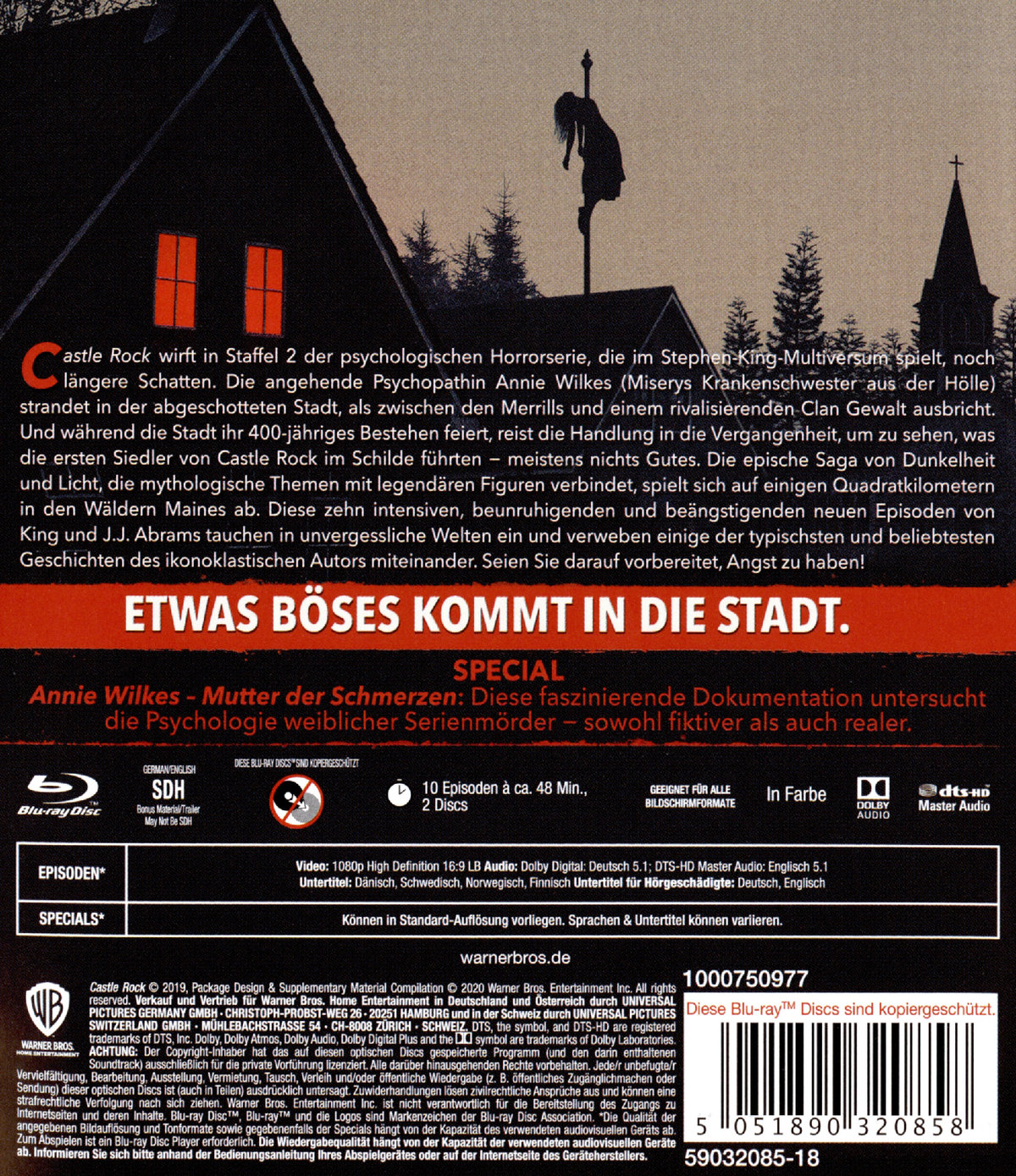"Castle Rock" wirft in Staffel 2 der psychologischen Horrorserie, die im Stephen-King-Multiversum spielt, noch längere Schatten.Die angehende Psychopathin Annie Wilkes (Miserys Krankenschwester aus der Hölle) strandet in der abgeschotteten Stadt, als zwischen den Merrills und einem rivalisierenden Clan Gewalt ausbricht. Und während die Stadt ihr 400-jähriges Bestehen feiert, reist die Handlung in die Vergangenheit, um zu sehen, was die ersten Siedler von Castle Rock im Schilde führten - meistens nichts Gutes.Die epische Saga von Dunkelheit und Licht, die mythologische Themen mit legendären Figuren verbindet, spielt sich auf einigen Quadratkilometern in den Wäldern Maines ab.Diese zehn intensiven, beunruhigenden und beängstigenden neuen Episoden von King und J.J. Abrams tauchen in unvergessliche Welten ein und verweben einige der typischsten und beliebtesten Geschichten des ikonoklastischen Autors miteinander. Seien Sie darauf vorbereitet, Angst zu haben!Alle 10 Episoden der 2. Staffel auf 3 DVDs bzw. 2 Blu-rays.Episodenübersicht- Möge der Fluss fließen- Neu-Jerusalem- Ewige Bande- Hoffnung- Ein Ort zum Lachen- Mutter- Das Wort- Dreck- Gewährleistungsausschuss- Sauber