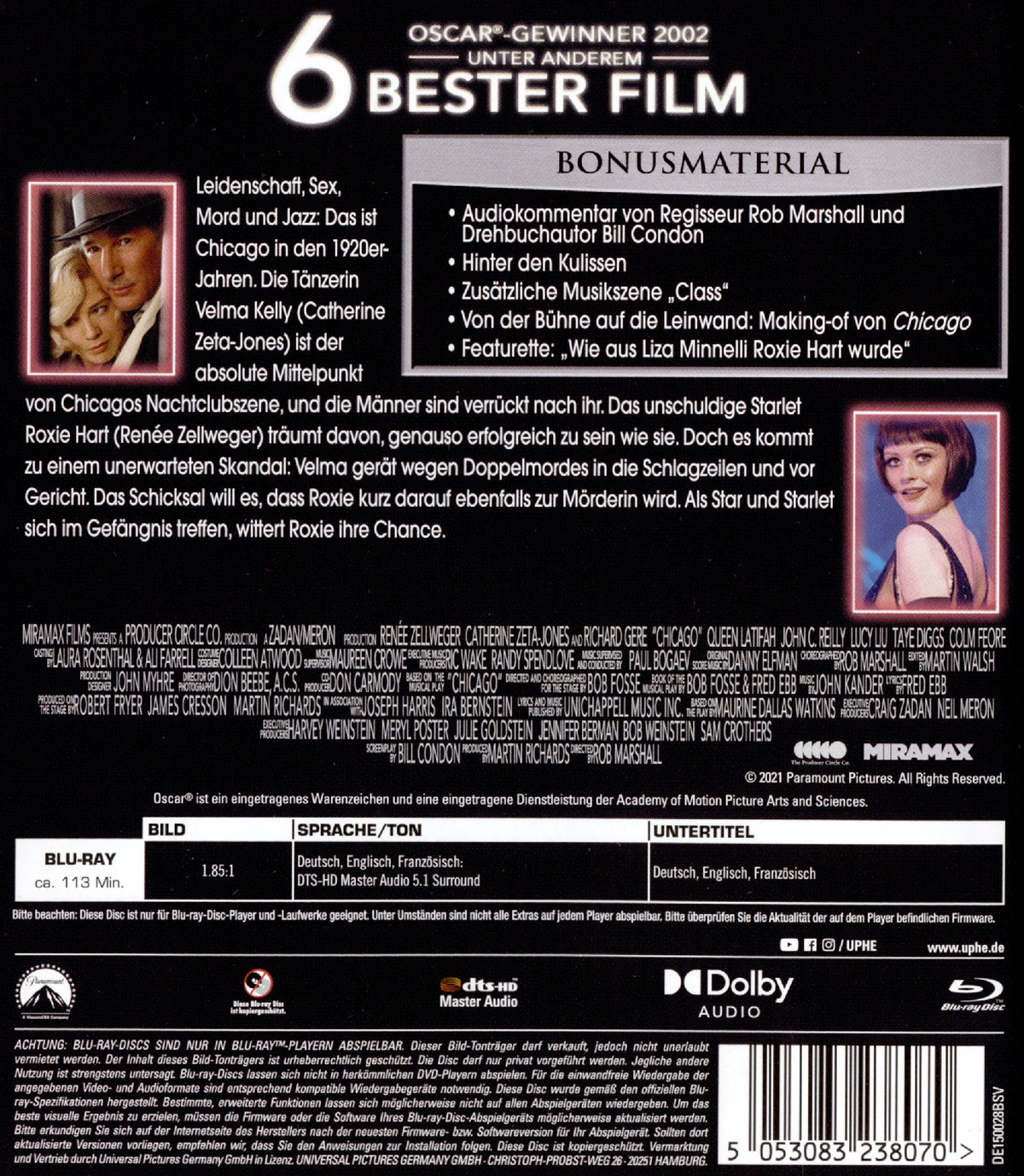 Audiokommentar von Regisseur Rob Marshall und Drehbuchautor Bill Condon 3 Hinter den Kulissen, Zusätzliche Musikszene "Class", Von der Buhne auf die Leinwand: Making-of von Chicago, Featurette: "Wie aus Liza Minnelli Roxie Hart wurde"