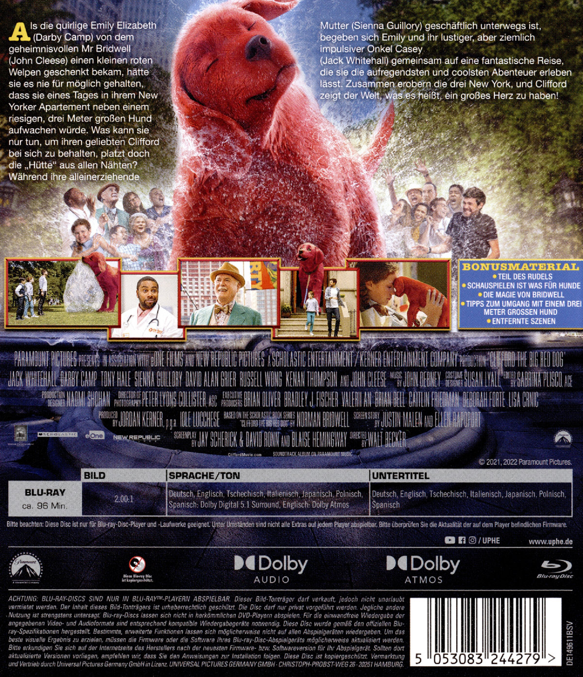 Als die quirlige Emily Elizabeth (Darby Camp) von dem geheimnisvollen Mr. Bridwell (John Cleese) einen kleinen roten Welpen geschenkt bekommen hat, hätte sie es nie für möglich gehalten, dass sie eines Tages in ihrem New Yorker Appartement neben einem riesigen, drei Meter großen Hund aufwachen würde.Was kann sie nur tun, um ihren geliebten Clifford bei sich zu behalten, platzt doch die "Hütte" aus allen Nähten? Während ihre alleinerziehende Mutter (Sienna Guillory) geschäftlich unterwegs ist, begeben sich Emily und ihr lustiger, aber ziemlich impulsiver Onkel Casey (Jack Whitehall) gemeinsam auf eine fantastische Reise, die sie die aufregendsten und coolsten Abenteuer erleben lässt.Gemeinsam erobern die drei New York, und Clifford zeigt der Welt, was es heißt, ein großes Herz zu haben!