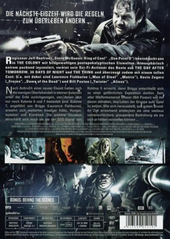 Regisseur Jeff Renfroe („Steve McQueen: King of Cool“, „One Point O“) beeindruckt uns in THE COLONY mit bildgewaltigen postapokalyptischen Eiswelten. Atmosphärisch extrem packend inszeniert, vereint sein Sci-Fi-Actioner das Beste aus THE DAY AFTER TOMORROW, 30 DAYS OF NIGHT und THE THING und überzeugt zudem mit einem tollen Cast: U.a. mit dabei sind Laurence Fishburne („Man of Steel”, „Matrix”), Kevin Zegers („Frozen“, „Dawn of the Dead”) und Bill Paxton („Twister”, „Aliens”). Nach Anbruch einer neuen Eiszeit hatten sich die wenigen Überlebenden in kleinen Kolonien unter der Erde zurückgezogen, von denen jetzt nur noch Kolonie 5 und 7 besiedelt sind. Kolonie 7, angeführt von Briggs (Laurence Fishburne), erwehrt sich weiterhin frostiger Kälte, Hunger, Isolation und Krankheit. Die prekäre Situation verschärft sich noch als sie ein SOS-Signal von Kolonie 5 erreicht, denn Briggs entschließt sich zu einer gefährlichen Expedition dorthin. Sein alter Waffenkamerad Mason (Bill Paxton) will ihn davon abhalten, das Leben der Gruppe aufs Spiel zu setzen. Wie sich herausstellt, aus gutem Grund: ihr Ziel erreichend entdecken sie eine weitaus unmenschlichere, grausamere Bedrohung als sie sich je hätten vorstellen können ... .
