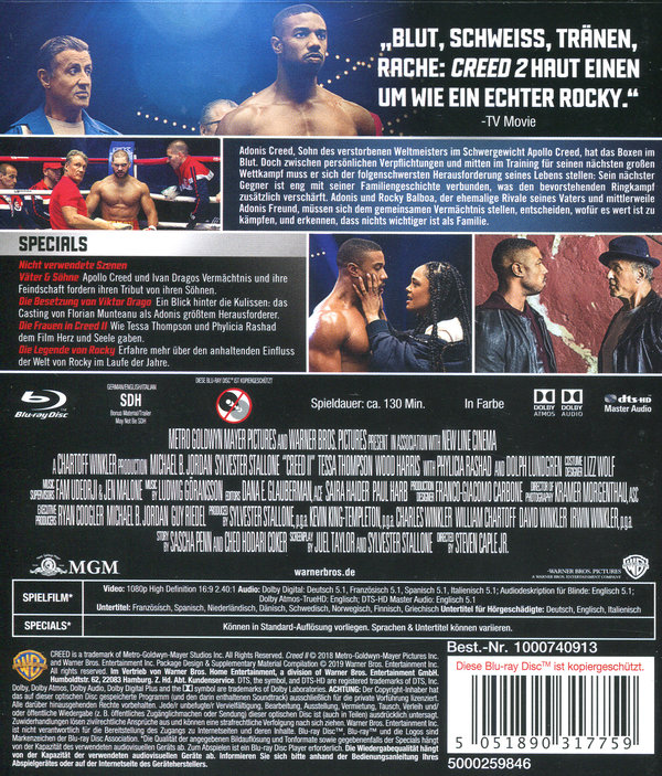 Für Adonis Creed ist das Leben ein Balanceakt geworden. Neben persönlichen Verpflichtungen und dem Trainingsprogramm zur Vorbereitung auf seinen nächsten Kampf, steht ihm die größte Herausforderung seines Lebens bevor: Da sein Gegner eng mit seiner Familiengeschichte verbunden ist, steht der bevorstehende Kampf im Ring unter besonderen Vorzeichen. Doch Rocky Balboa steht Adonis zur Seite und zusammen stellen sich die beiden dem Vermächtnis, das sie verbindet. Dabei werden sie mit der Frage konfrontiert, ob sich der Kampf überhaupt lohnt – letztlich erkennen sie, dass die Familie das Band ist, das alles zusammenhält. In „Creed II“ geht es um die Rückkehr zu den Anfängen: Was ist der Stoff, aus dem die Champions sind? Adonis und Rocky begreifen: Egal wohin der Lebensweg führt – niemand kann seiner Vergangenheit entkommen.
