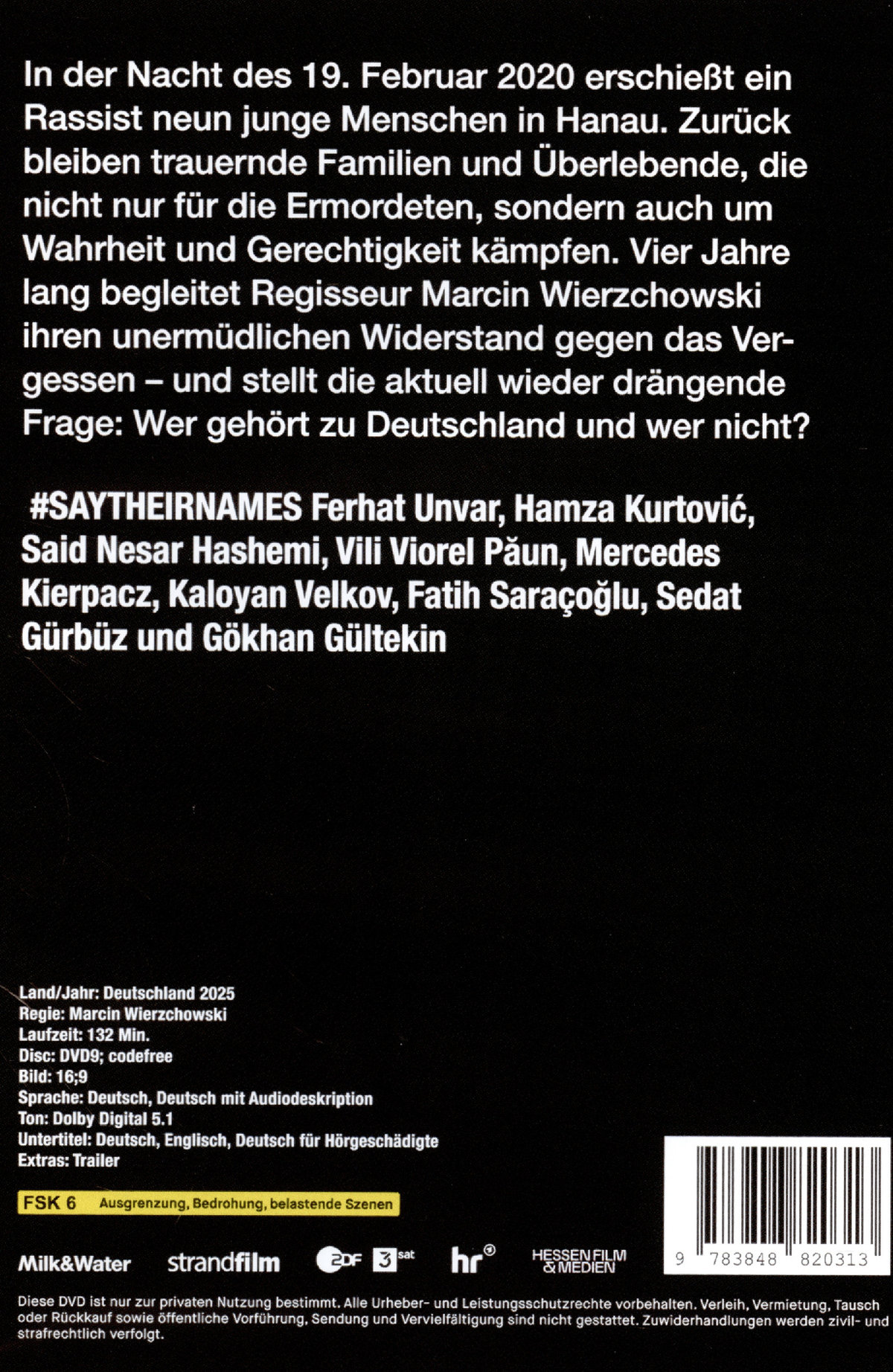 In der Nacht des 19. Februar 2020 erschießt ein Rassist neun junge Menschen in Hanau. Zurück bleiben trauernde Familien und Überlebende, die nicht nur für die Ermordeten, sondern auch um Wahrheit und Gerechtigkeit kämpfen. Vier Jahre lang begleitet Regisseur Marcin Wierzchowski ihren unermüdlichen Widerstand gegen das Vergessen – und stellt die aktuell wieder drängende Frage: Wer gehört zu Deutschland und wer nicht? #SAYTHEIRNAMES Ferhat Unvar, Hamza Kurtovi?, Said Nesar Hashemi, Vili Viorel P?un, Mercedes Kierpacz, Kaloyan Velkov, Fatih Saraço?lu, Sedat Gürbüz und Gökhan Gültekin