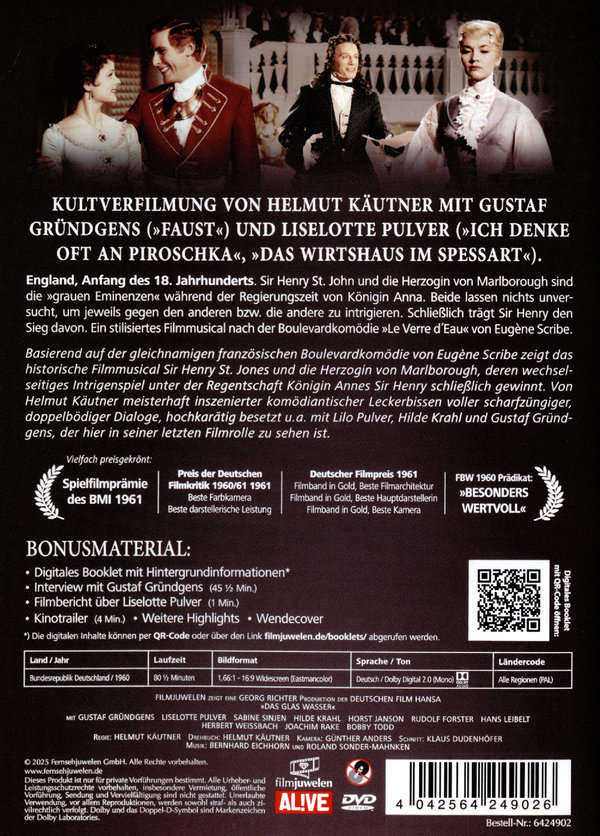 England, Anfang des 18. Jahrhunderts. Sir Henry St. John und die Herzogin von Marlborough sind die "grauen Eminenzen" während der Regierungszeit von Königin Anna. Beide lassen nichts unversucht, um jeweils gegen den anderen bzw. die andere zu intrigieren. Schließlich trägt Sir Henry den Sieg davon. Ein stilisiertes Filmmusical nach der Boulevardkomödie "Le Verre d'Eau" von Eugène Scribe. Basierend auf der gleichnamigen französischen Boulevardkomödie von Eugène Scribe zeigt das historische Filmmusical Sir Henry St. Jones und die Herzogin von Marlborough, deren wechselseitiges Intrigenspiel unter der Regentschaft Königin Annes Sir Henry schließlich gewinnt. Von Helmut Käutner meisterhaft inszenierter komödiantischer Leckerbissen voller scharfzüngiger, doppelbödiger Dialoge, hochkarätig besetzt u. a. mit Lilo Pulver, Hilde Krahl und Gustaf Gründgens, der hier in seiner letzten Filmrolle zu sehen ist.