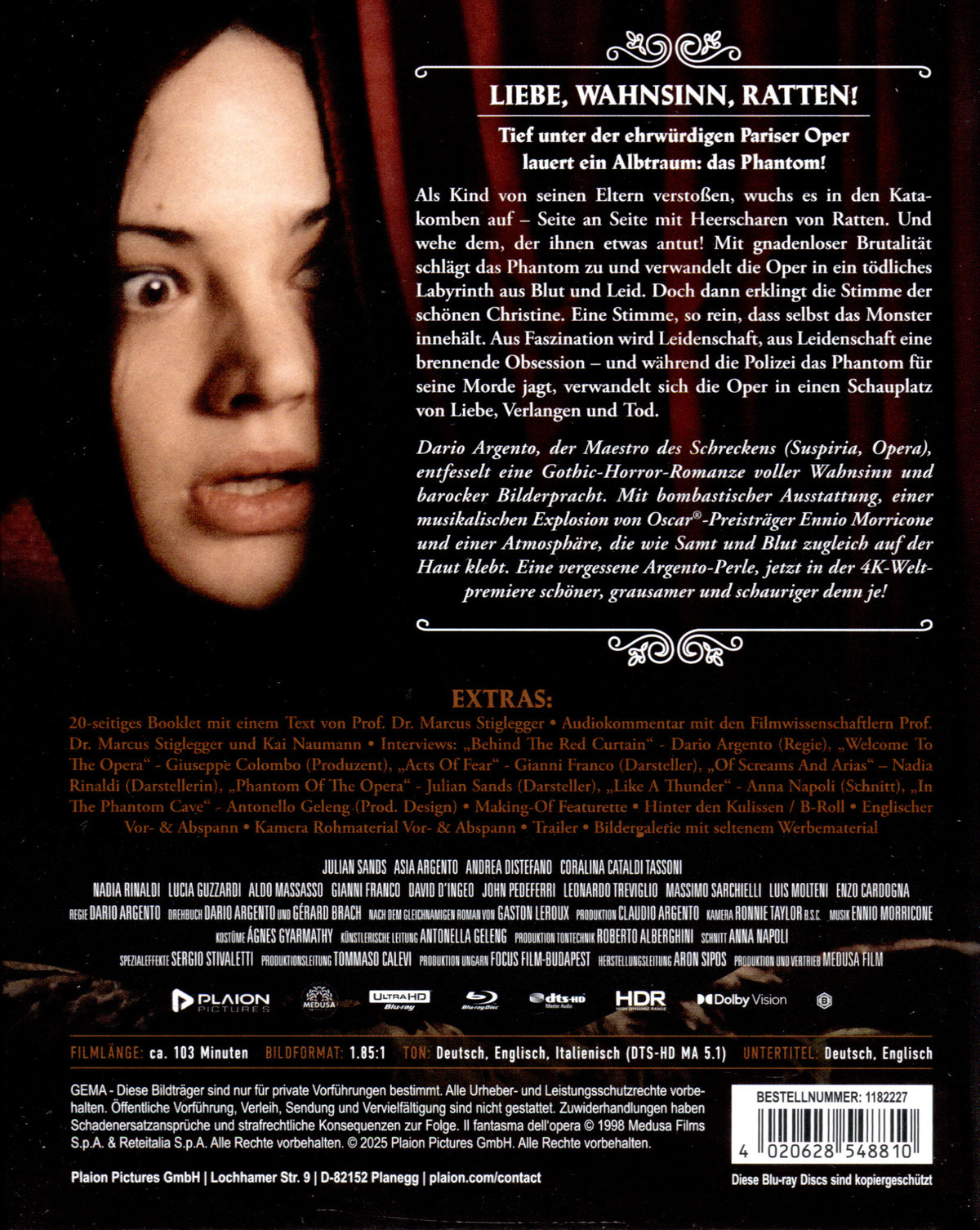 Mit großen Emotionen und oppulenten Bildern setzt der Maestro des Schreckens, Dario Argento (SUSPIRIA), den zeitlosen Roman von Gaston Leroux in wahrlich opernhafter Manier um. Abseits von Musical-Kitsch ist Argentos Adaption eine Gothic-Horror-Romanze, die mit grandioser Ausstattung und brillianter Filmmusik von Oscar®-Preisträger Ennio Morricone zu überzeugen weiß. Eine unterschätzte Perle, die in dieser 4K-Weltpremiere endlich ihre wahre Schönheit entfalten kann.