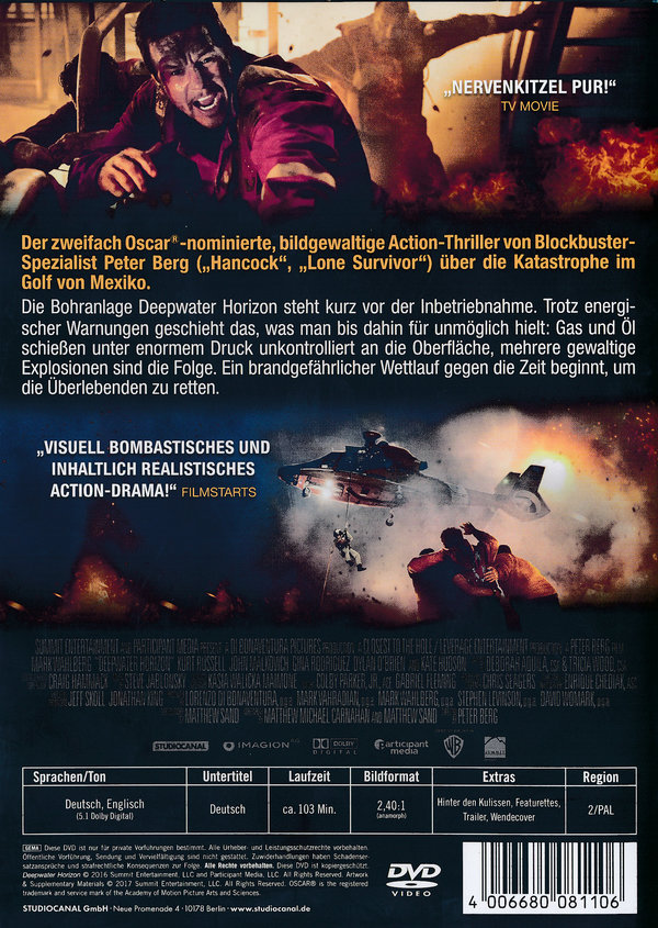 Blockbuster-Spezialist Peter Berg hat bereits mit "Hancock" und "Lone Survivor" sein Gespür für erstklassiges Action-Kino bewiesen. In DEEPWATER HORIZON rekonstruiert er die letzten, folgenschweren Stunden auf der Ölplattform und erzählt die packende Geschichte jener Männer, die bei dem Versuch, das Unvermeidliche abzuwenden, ihr Leben riskierten. Entstanden ist ein bildgewaltiges Action-Spektakel mit Starbesetzung. Neben Mark Wahlberg ("Ted", "Transformers: Ära des Untergangs") in der Hauptrolle überzeugen John Malkovich ("R.E.D."), Kurt Russell ("The Hateful 8"), Kate Hudson ("Bride Wars - Beste Feindinnen") und Dylan O'Brien ("Maze Runner"-Reihe). DEEPWATER HORIZON ist eine Produktion von Di Bonaventura Pictures, Closest to the Hole, Leverage Entertainment.