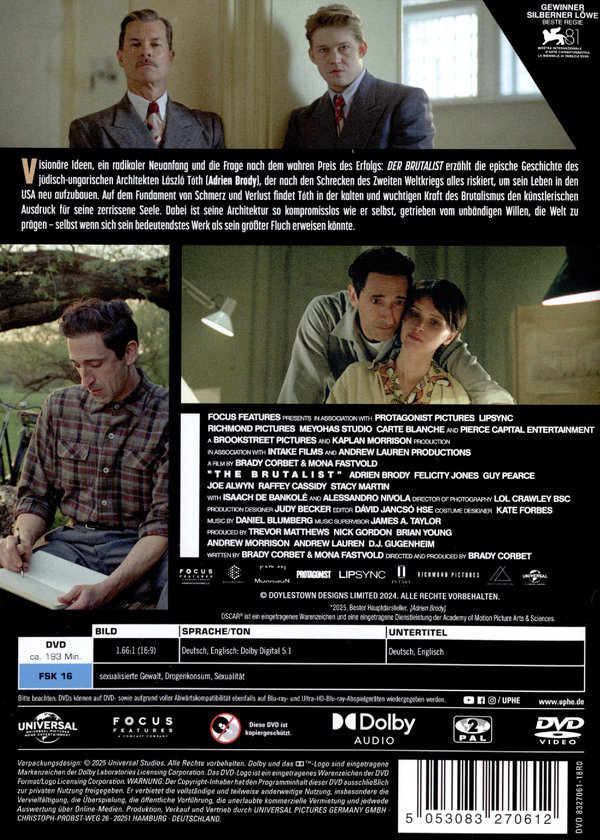 Visionäre Ideen, ein radikaler Neuanfang und die Frage nach dem wahren Preis des Erfolgs: "Der Brutalist" erzählt die epische Geschichte des jüdisch-ungarischen Architekten László Toth, der nach den Schrecken des Zweiten Weltkriegs alles riskiert, um sein Leben in den USA neu aufzubauen. Auf dem Fundament von Schmerz und Verlust findet Toth in der kalten und wuchtigen Kraft des Brutalismus den künstlerischen Ausdruck für seine zerrissene Seele. Dabei ist seine Architektur so kompromisslos wie er selbst, getrieben vom unbändigen Willen, die Welt zu prägen - selbst wenn sich sein bedeutendstes Werk als sein größter Fluch erweisen könnte.