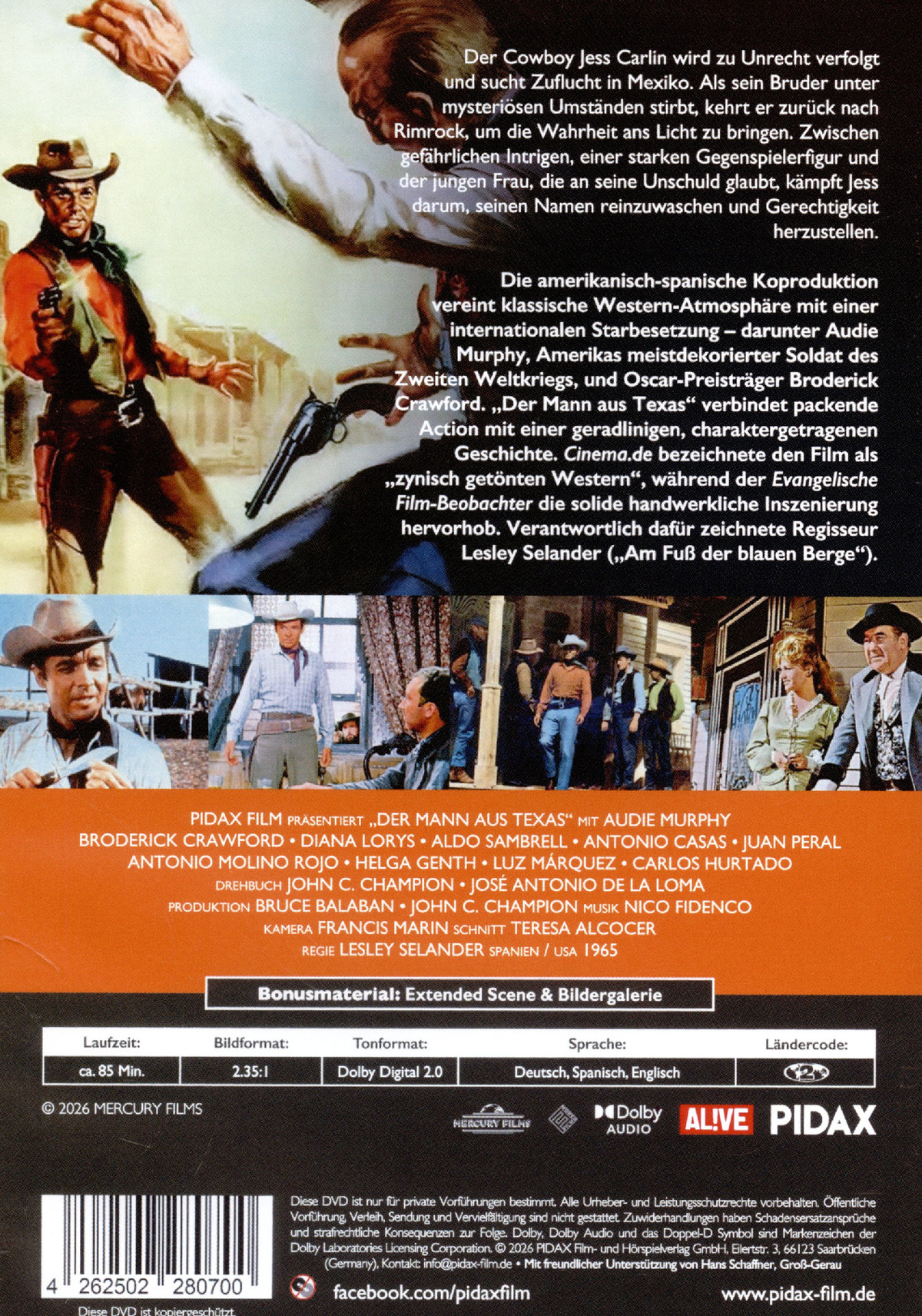 Der Cowboy Jess Carlin wird zu Unrecht verfolgt und sucht Zuflucht in Mexiko. Als sein Bruder unter mysteriösen Umständen stirbt, kehrt er zurück nach Rimrock, um die Wahrheit ans Licht zu bringen. Zwischen gefährlichen Intrigen, einer starken Gegenspielerfigur und der jungen Frau, die an seine Unschuld glaubt, kämpft Jess darum, seinen Namen reinzuwaschen und Gerechtigkeit herzustellen. Die amerikanisch-spanische Koproduktion vereint klassische Western-Atmosphäre mit einer internationalen Starbesetzung – darunter Audie Murphy, Amerikas meistdekorierter Soldat des Zweiten Weltkriegs, und Oscar-Preisträger Broderick Crawford. „Der Mann aus Texas“ verbindet packende Action mit einer geradlinigen, charaktergetragenen Geschichte. Cinema.de bezeichnete den Film als „zynisch getönten Western“, während der Evangelische Film-Beobachter die solide handwerkliche Inszenierung hervorhob. Verantwortlich dafür zeichnete Regisseur Lesley Selander („Am Fuß der blauen Berge“).