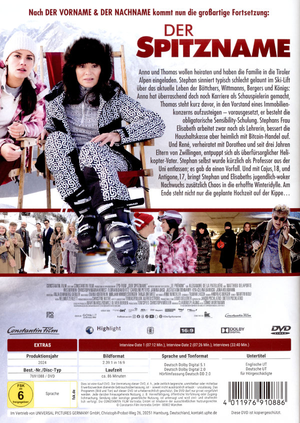 Nach den erfolgreichen Komödien "Der Vorname" & "Der Nachname" kommt nun die fulminante Fortsetzung "Der Spitzname"Anna und Thomas wollen heiraten und haben die Familie in die Tiroler Alpen ein-geladen. Stephan sinniert typisch schlecht gelaunt im Ski-Lift über das aktuelle Leben der Böttchers, Wittmanns, Bergers und Königs: Anna hat überraschend doch noch Karriere als Schauspielerin gemacht, Thomas steht kurz davor, in den Vorstand eines Immobilienkonzerns aufzusteigen - vorausgesetzt, er besteht die obligatorische Sensibility-Schulung. Stephans Frau Elisabeth arbeitet zwar noch als Lehrerin, bessert die Haushaltskasse aber heimlich mit Bitcoin-Handel auf. Und René, verheiratet mit Dorothea und seit drei Jahren Eltern von Zwillingen, entpuppt sich als überfürsorglicher Helikopter-Vater. Stephan selbst wurde kürzlich als Professor aus der Uni entlassen; es gab da einen Vorfall. Und mit Cajus, 18, und Antigone, 17, bringt Stephan und Elisabeths jugendlich-woker Nachwuchs zusätzlich Chaos in die erhoffte Winteridylle. Am Ende steht nicht nur die geplante Hochzeit auf der Kippe…Vor der idyllischen Kulisse der Tiroler Alpen liefert sich die hochkarätige Besetzung der Gesellschaftskomödie mit Iris Berben, Christoph Maria Herbst, Florian David Fitz, Caroline Peters, Justus von Dohnányi und Janina Uhse einen pointierten Schlagabtausch mit Scharfsinn und Witz. Regie führte Sönke Wortmann, das Drehbuch stammt von Claudius Pläging.