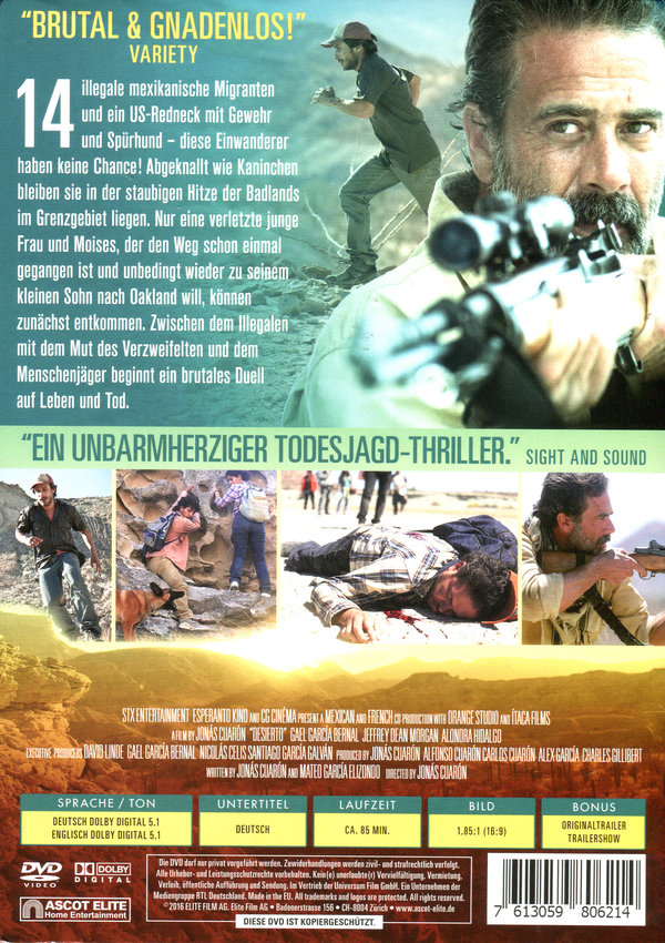 14 illegale mexikanische Migranten und ein US-Redneck mit Gewehr und Spürhund – diese Einwanderer haben keine Chance! Abgeknallt wie Kaninchen bleiben sie in der staubigen Hitze der Badlands im Grenzgebiet liegen. Nur eine verletzte junge Frau und Moises, der den Weg schon einmal gegangen ist und unbedingt wieder zu seinem kleinen Sohn nach Oakland will, können zunächst entkommen. Zwischen dem Illegalen mit dem Mut des Verzweifelten und dem Menschenjäger beginnt ein brutales Duell auf Leben und Tod.