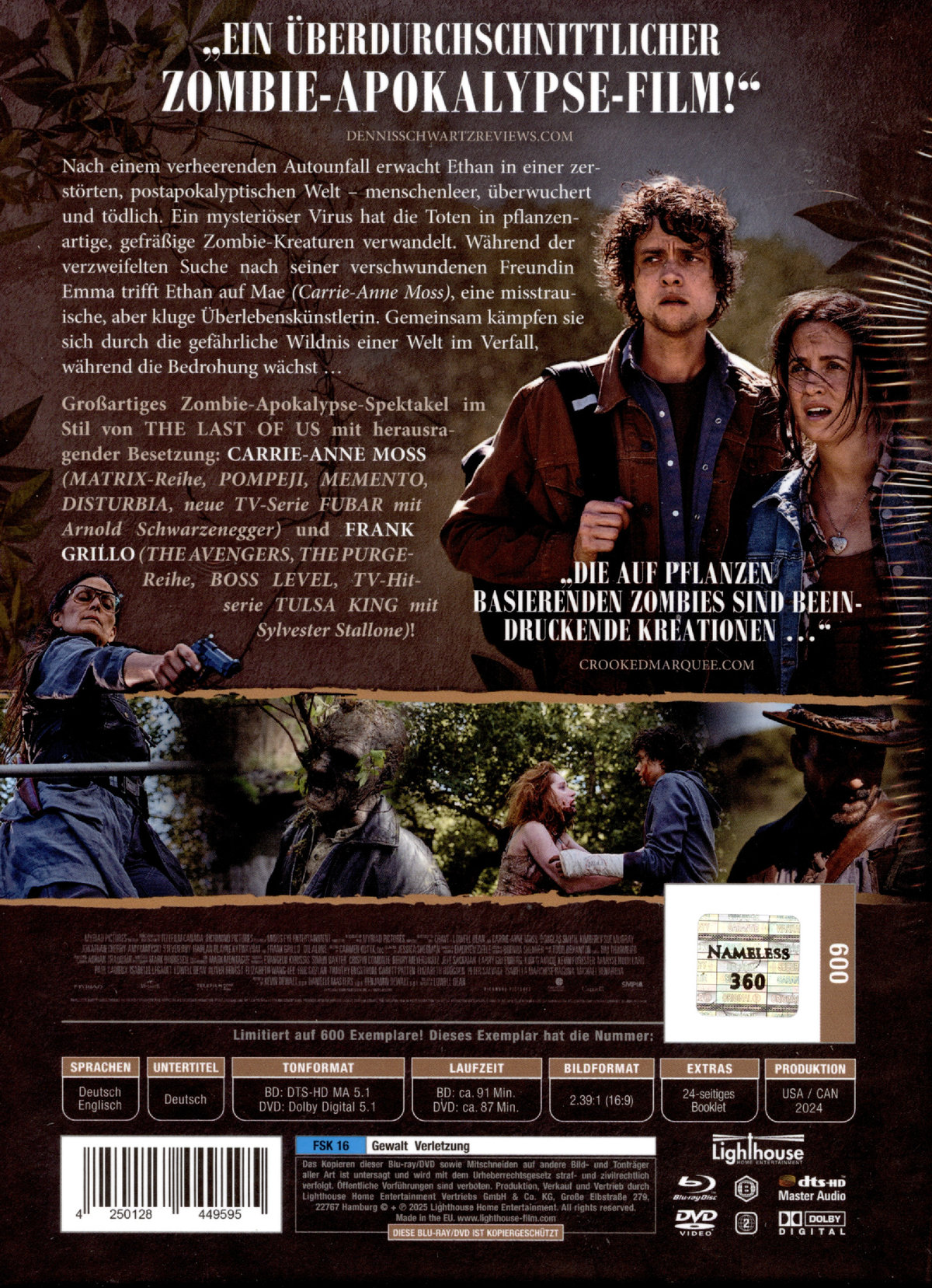 Nach einem verheerenden Autounfall erwacht Ethan in einer zerstörten, postapokalyptischen Welt – menschenleer, überwuchert und tödlich. Ein mysteriöser Virus hat die Toten in pflanzenartige, gefräßige Zombie-Kreaturen verwandelt. Während der verzweifelten Suche nach seiner verschwundenen Freundin Emma trifft Ethan auf Mae (Carrie-Anne Moss), eine misstrauische, aber kluge Überlebenskünstlerin. Gemeinsam kämpfen sie sich durch die gefährliche Wildnis einer Welt im Verfall, während die Bedrohung wächst … Großartiges Zombie-Apokalypse-Spektakel im Stil von THE LAST OF US mit herausragender Besetzung: Carrie-Anne Moss (Matrix-Reihe, Pompeji, Memento, Disturbia, Fubar) & Frank Grillo (The Avengers, The Purge-Reihe, Boss Level, Tulsa King) Gewinn mehrerer Horror-Festivals (u.a. Helifax, Canadian Screen Award)