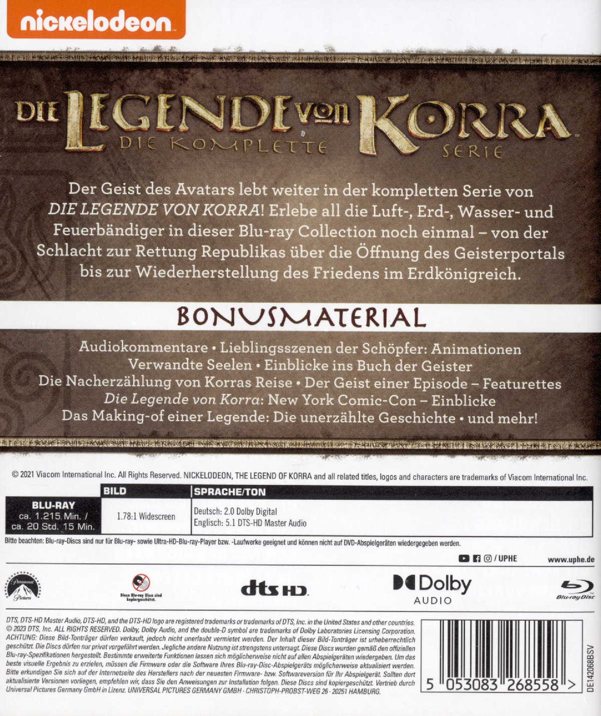 Erlebe "Die Legende von Korra", die neue fesselnde Heldengeschichte der Schöpfer von "Avatar - Der Herr der Elemente". Die freche, mutige Korra ist der neue Avatar. Neugierig und tapfer stellt sie sich einer Vielzahl von Bedrohungen und Widersachern. Während ihrer abenteuerlichen Reise tritt sie in die Geisterwelt ein, entdeckt neue Luftbändiger und sorgt dafür, dass in Republic City alles wieder in Ordnung kommt.Alle Episoden auf 8 DVDsEpisodenübersichtBuch 1: LuftDisc 1- Willkommen in Republic City- Wie ein Blatt im Wind- Die Enthüllung- Die Stimme in der Nacht- Der Geist des Wettbewerbs- Und der Gewinner ist ...Disc 2- Das Nachspiel- Wenn Extreme aufeinandertreffen- Aus der Vergangenheit- Das Blatt wendet sich- Eine Leiche im Keller- EndspielBuch 2: GeisterDisc 3- Ein rebellischer Geist- Das Südlicht- Bürgerkrieg (1)- Bürgerkrieg (2)- Friedenstruppen- Verdeckte Ermittlungen- Wie alles begann (1)Disc 4- Wie alles begann (2)- Wege in die Geisterwelt- Ein neues spirituelles Zeitalter- Die Nacht der tausend Sterne- Die harmonische Konvergenz- Finsternis bricht herein- Licht in der FinsternisBuch 3: VeränderungDisc 5- Frischer Wind- Wiedergeburt- Die Erdkönigin- Gefahr droht- Der Metall-Clan- Alte Wunden- Die ersten LuftbändigerDisc 6- Der Feind im Inneren- Die Observation- Lang lebe die Königin- Das Ultimatum- Tritt ein in die Leere- Das Gift des Roten LotusBuch 4: GleichgewichtDisc 7- Nach all den Jahren- Korra (ist) allein- Die Krönung- Die Berufung- Der...