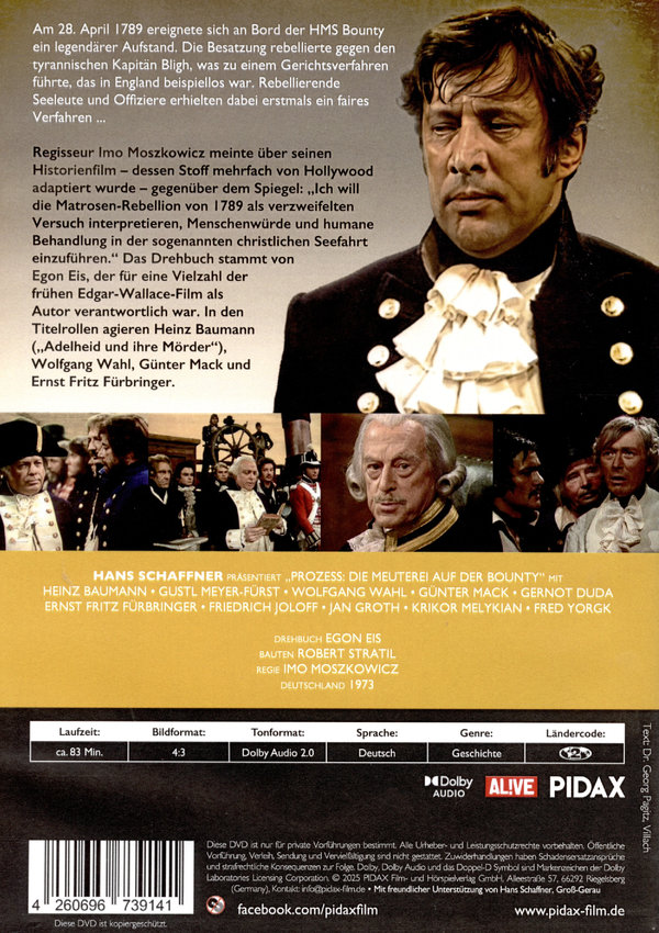 Am 28. April 1789 ereignete sich an Bord der HMS Bounty ein legendärer Aufstand. Die Besatzung rebellierte gegen den tyrannischen Kapitän Bligh, was zu einem Gerichtsverfahren führte, das in England beispiellos war. Rebellierende Seeleute und Offiziere erhielten dabei erstmals ein faires Verfahren ... Regisseur Imo Moszkowicz meinte über seinen Historienfilm – dessen Stoff mehrfach von Hollywood adaptiert wurde – gegenüber dem Spiegel: „Ich will die Matrosen-Rebellion von 1789 als verzweifelten Versuch interpretieren, Menschenwürde und humane Behandlung in der sogenannten christlichen Seefahrt einzuführen.“ Das Drehbuch stammt von Egon Eis, der für eine Vielzahl der frühen Edgar-Wallace-Film als Autor verantwortlich war. In den Titelrollen agieren Heinz Baumann („Adelheid und ihre Mörder“), Wolfgang Wahl, Günter Mack und Ernst Fritz Fürbringer.