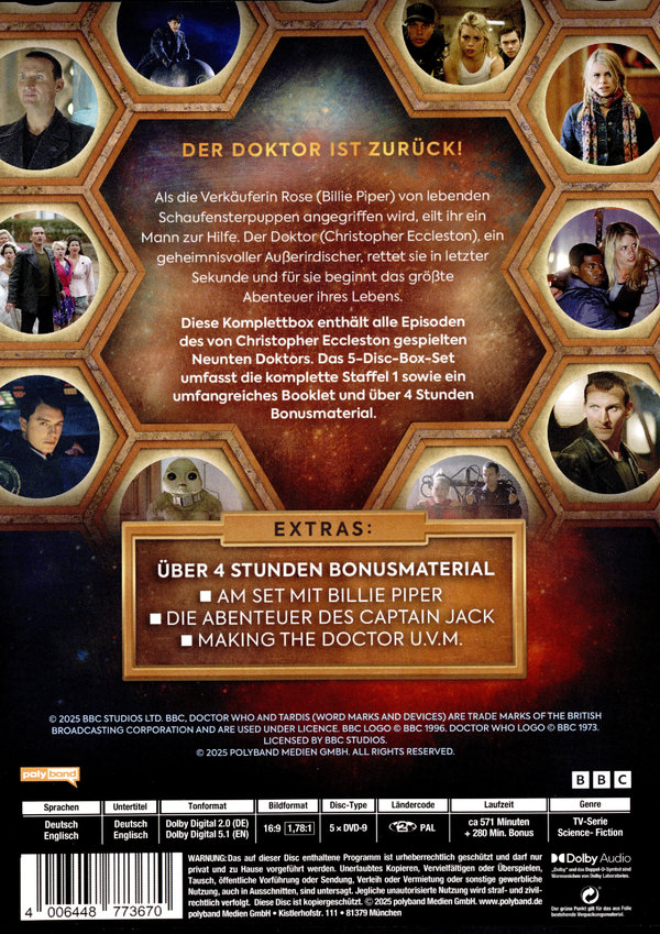 Erlebe die atemberaubende, komplette erste Staffel von Doctor Who - der einzigen Staffel mit Christopher Eccleston - mit über 280 Minuten Bonusmaterial!