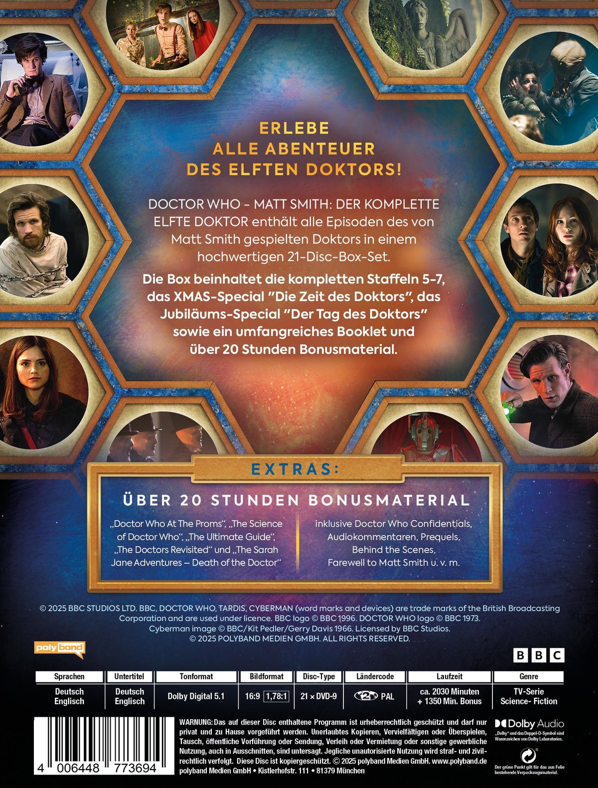 Das Box-Set beinhaltet die kompletten Staffeln 5, 6 und 7, das XMAS-Special "Die Zeit des Doktors", das Jubiläumsspecial "Der Tag des Doktors" sowie über 20 Stunden Bonusmaterial.
